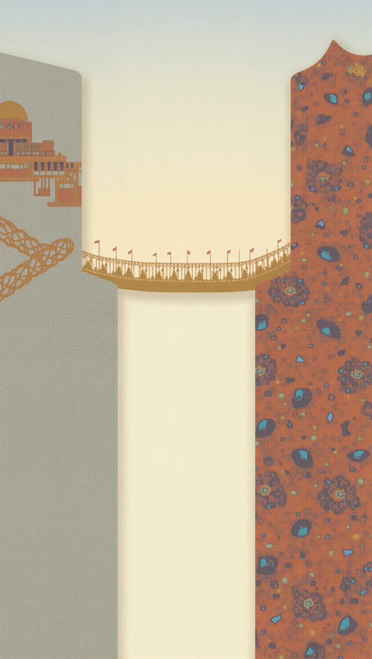 背景与顶部装饰:背景是柔和的渐变蓝到暖橙的天空色调,顶部排列着中式传统建筑(飞檐屋顶)、伊斯兰风格建筑(穹顶清真寺),以及带有花纹的装饰图案(几何纹样、花卉纹样),这些元素暗示了不同文化的联结。