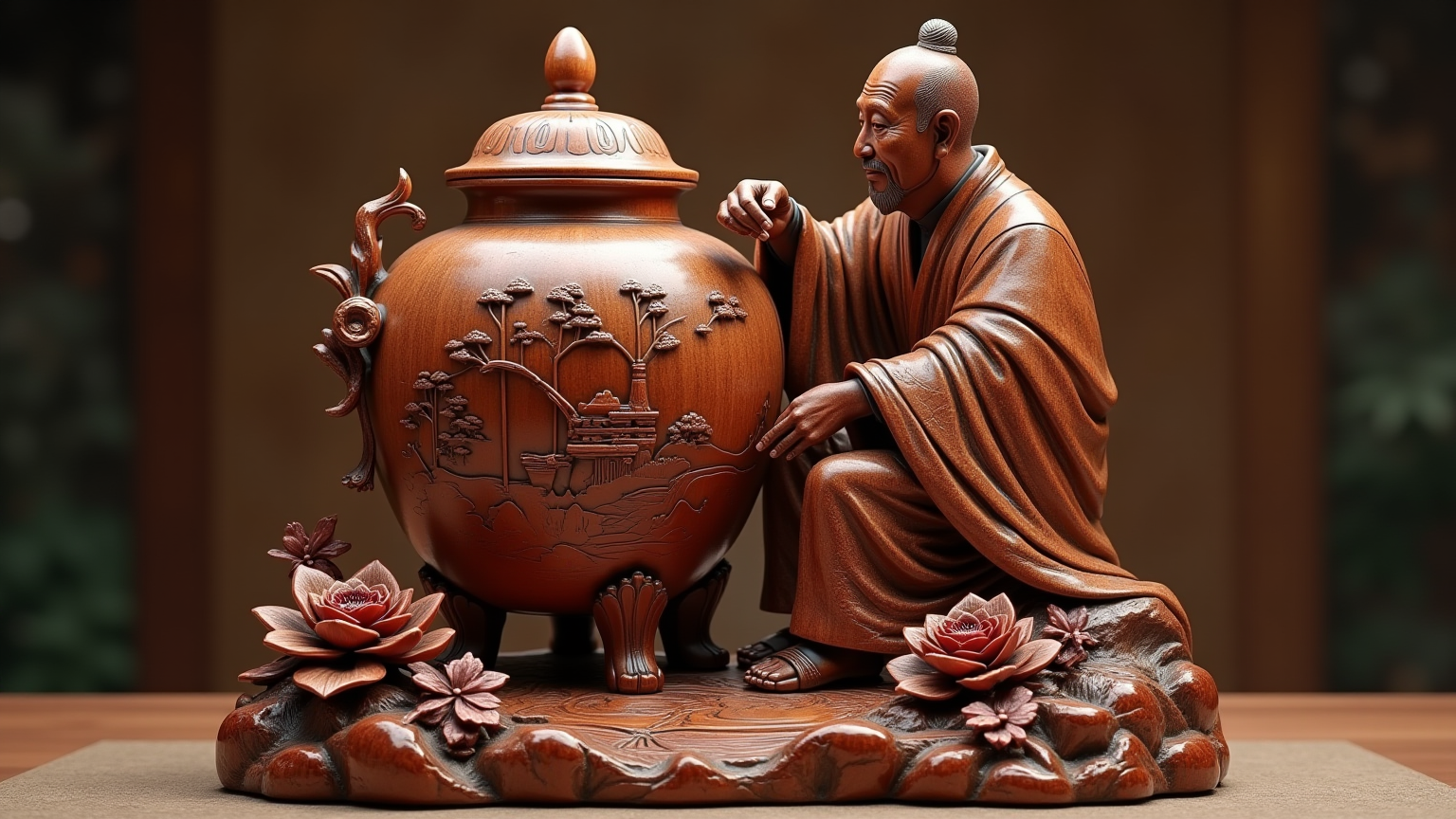 简介:紫檀木为材,以原始肌理复刻酒坊真境。雕工高细还原拔瓶塞瞬间,老木萨拉酒参考号清晰可辨,酒液结晶化作天山雪莲,酒坊浮雕与鉴湖水波纹隐于薄雾。
