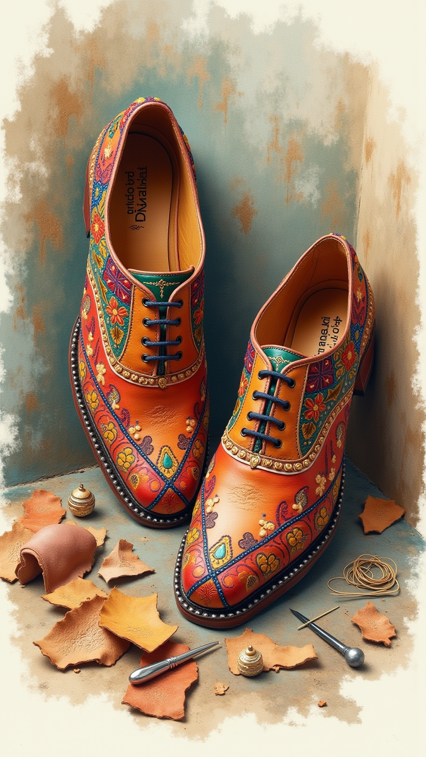 以维吾尔族传统阔赛(手工皮鞋)为视觉核心,融合浙江与阿克苏两地的经典材质与工艺语言,通过静物构图呈现跨地域文化之间的“纹样共生”与“技艺互融”。