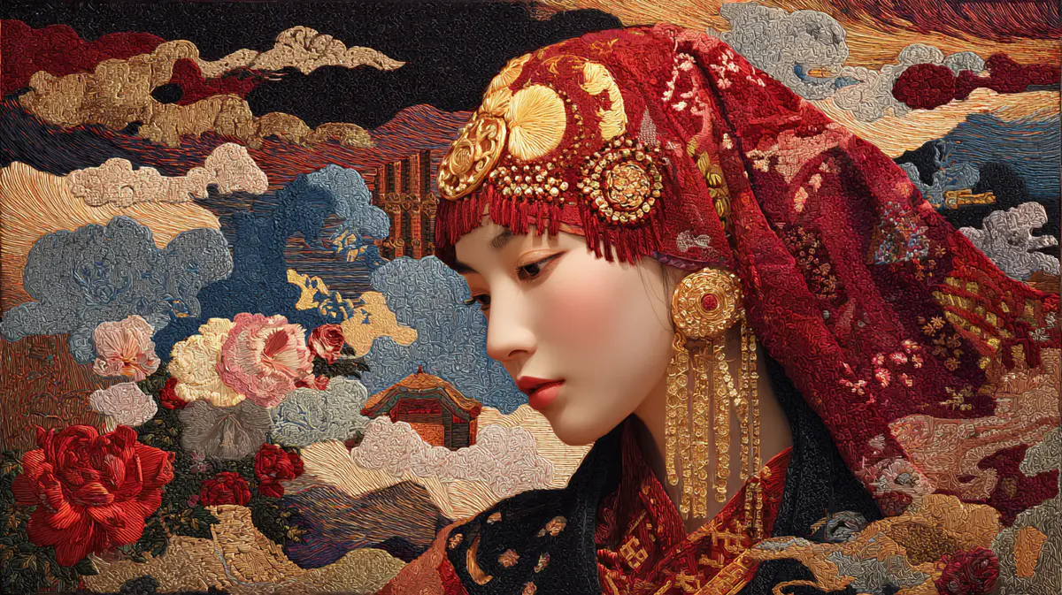 高质量高分辨率 大师杰作 主题是丝绸之路丛杭州到新疆 画面表现人物形象生动活泼可爱新疆美少女及杭州丝绸头巾服饰 画面左半部分为江浙地区小桥流水右边部分是阿克苏的鲜花盛开的草场和牛羊成群中以云彩渐变衔接以上为背景在白云中飘浮一款有中间以美丽的新疆维吾尔族少女为主要图像阿克苏地区民族特色的精美刺绣图案的丝巾戴在一美丽新疆女孩头上左右风景若隐若现突出人物造型