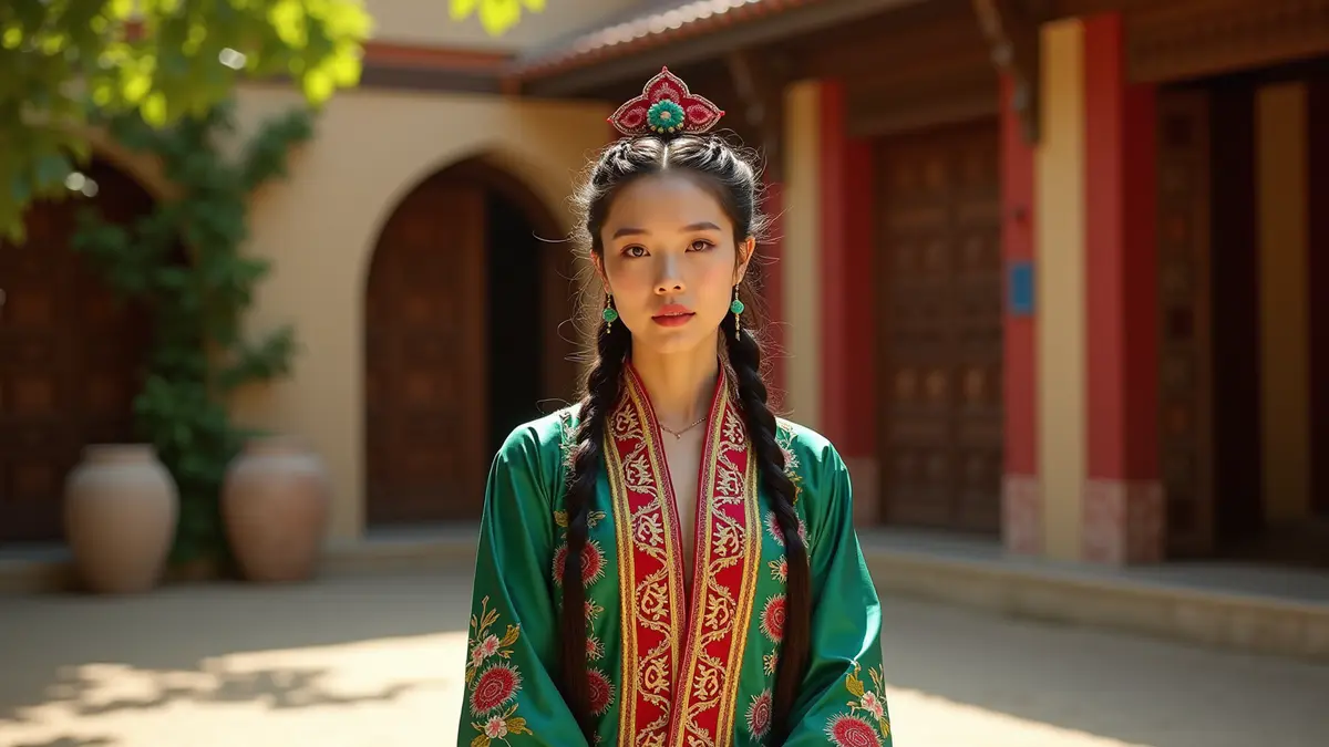 一位美丽的维吾尔族女性,梳着长辫子,身穿色彩鲜艳的传统艾德莱斯绸长袍,袍子是翠绿色、宝石红和日光黄。整个衣领、袖口和前襟都布满了精美的柯尔克孜族风格刺绣图案,包含风格化的盘羊角、蕨类植物和几何纹样,使用金线、白线和藏蓝色线绣成。她戴着一顶同样融合风格的刺绣朵帕(四楞小花帽)。背景是喀什老城阳光普照的庭院,有雕花木门和葡萄藤。照片级真实感,超精细,戏剧性光线,文化融合时尚。