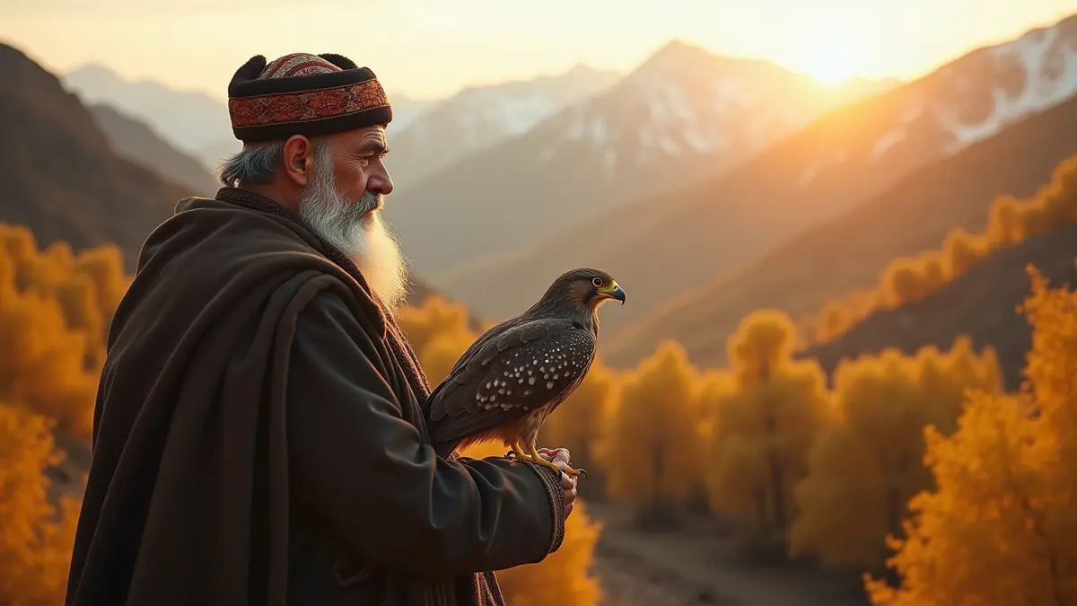 一位年长的维吾尔族鹰猎人,面容坚毅,留着灰白胡子,头戴传统维吾尔族绣花皮帽(吐马克帽),身穿深色棉袍,肩披斗篷,屹立在金色胡杨林的悬崖边。他戴着手套的手臂上伫立着一只目光锐利的金雕。背景是新疆帕米尔高原的壮丽秋景,雪山、峡谷和夕阳的暖光。画面充满史诗感,细节丰富,动态捕捉,民族风情,
