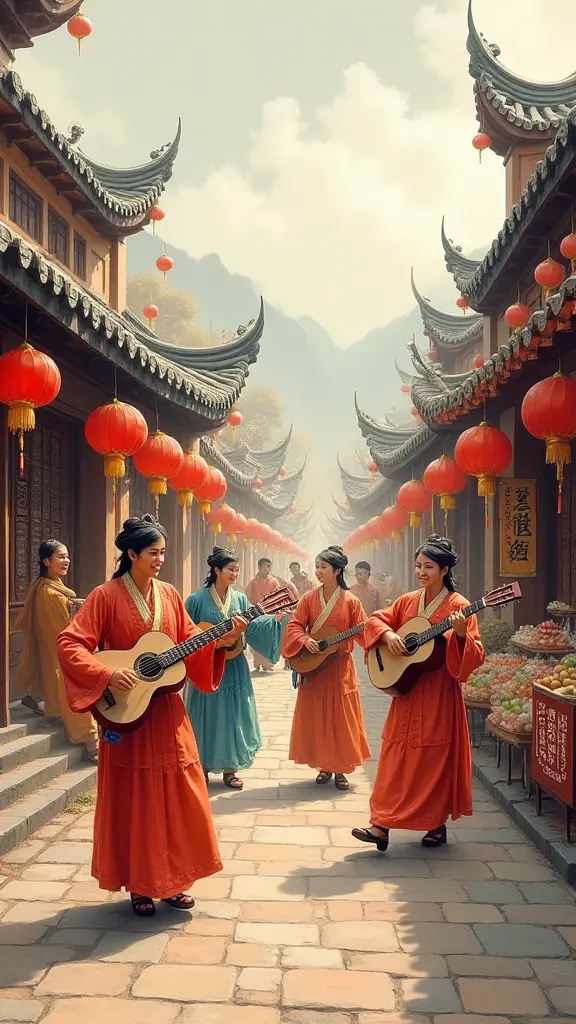 生成一张具有浙阿地区历史经典产业与非遗文化元素的绘画作品,结合浙江江南古镇石砖的景点,周边有卖囊的摊铺还有卖桂花糕的商铺,路中间有穿着维吾尔族服装的人,有的在跳舞,有的在弹龟兹古琴,表情欢快 要求能够准确传达历史经典产业与非遗文化的精髓。