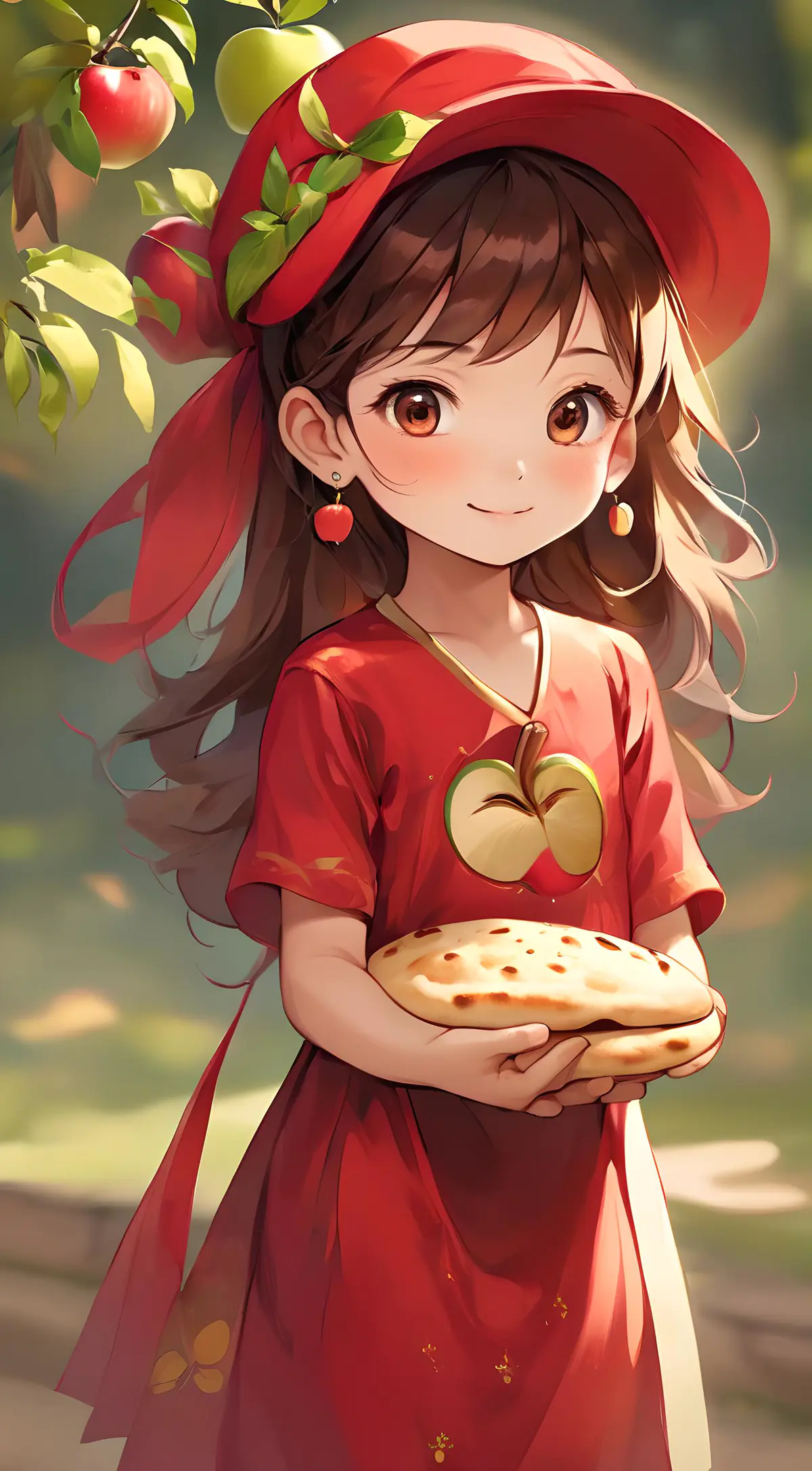 帮我生成一个小孩,头戴苹果的头套,穿着红色的小裙子,带着苹果的耳环,手里拿着馕饼,可爱风格