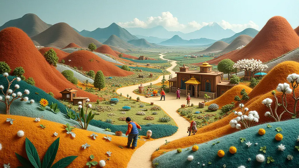 前景是绿洲边缘农田,毛毡农人正在劳作:有的用毛毡农具耕种(农具用木架 + 毛毡部件组合),有的采摘毛毡葡萄(彩色毛毡球模拟果实,毛毡藤条缠绕),有的晾晒毛毡棉花(白色短毛毡针刺,蓬松轻盈)。农田用不同颜色毛毡划分:嫩绿毛毡模拟麦田,深绿毛毡模拟蔬菜地,浅棕毛毡模拟棉花地,田埂用棕黄毛毡条拼接,缝几何纹样。