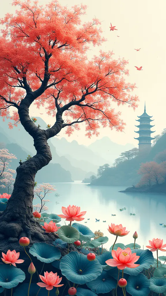 这幅图创意融合浙江江南山水与阿克苏地域风情,以浙江的莲荷、古塔为基底,融入阿克苏的红叶元素,借江南水景的温婉与丝路红叶的艳丽交织,勾勒出浙阿两地在自然美学与文化底蕴上的跨域共鸣,如同一首山水与丝路协奏的诗意乐...查看更多