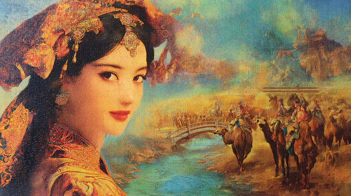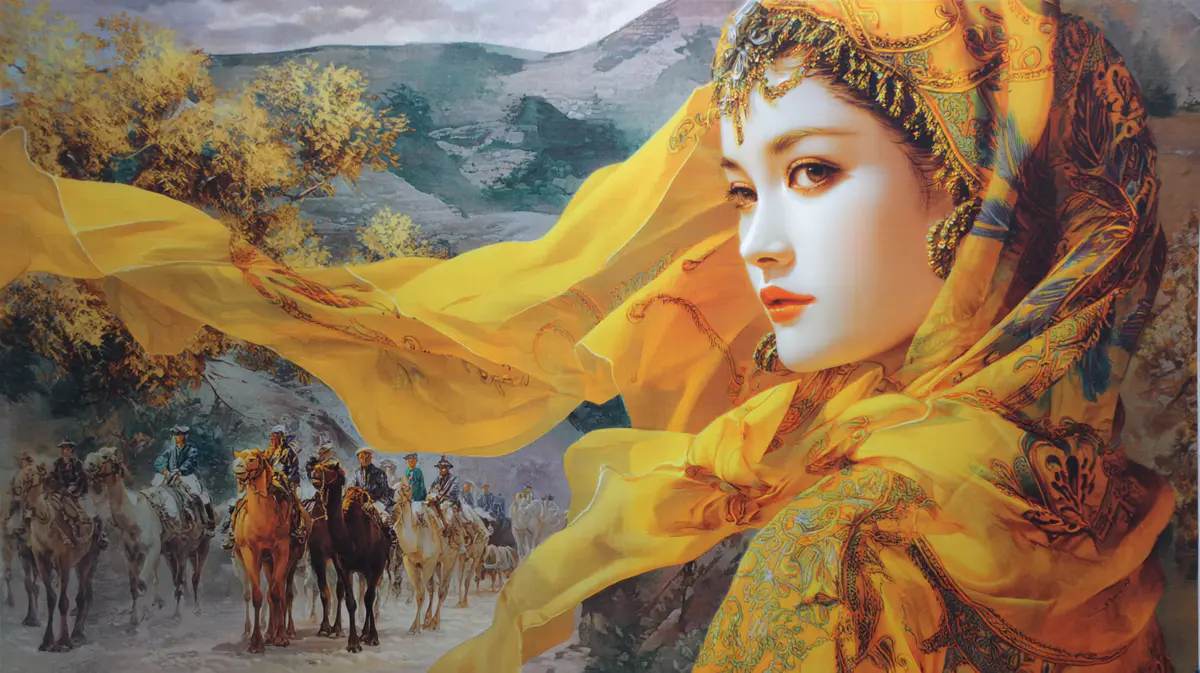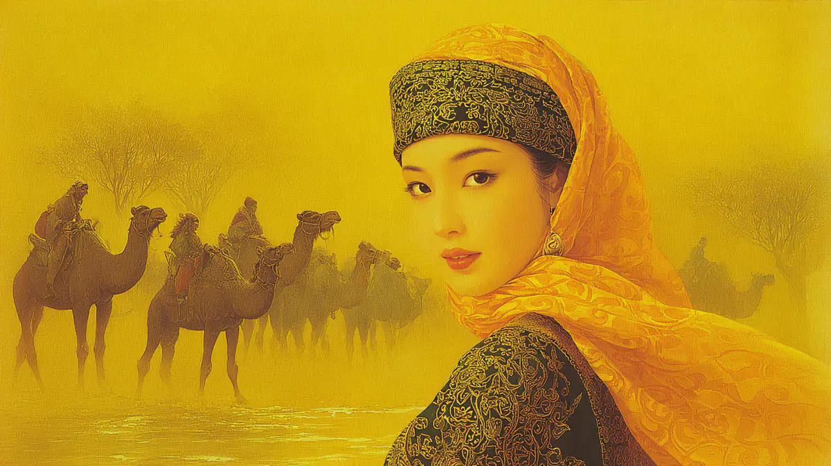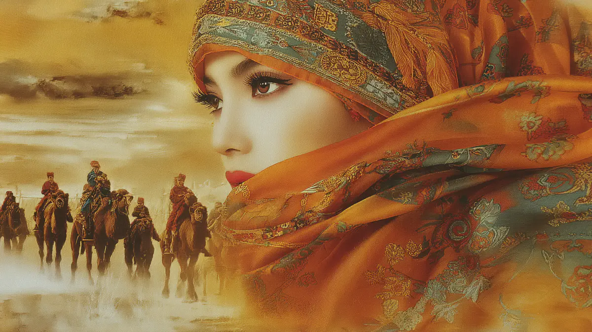 (高质量高分辨率 大师杰作 沙莫落日色调落日夕照主题是丝绸之路丛杭州到新疆 画面表现人物形象生动((活泼可爱新疆美少女及杭州丝绸头巾服饰 3/4人侧身回头动态优美画面))(((左半部分为江浙地区小桥流水)))((右边部分是阿克苏的金灿灿的胡杨林草场和牛羊成群中以云彩渐变衔接))以上为背景在白云中飘浮一款有中间以美丽的(((新疆维吾尔族少女为主要图像大眼 长睫毛 美 唇膏侧身回头远望阿克苏地区民族特色的精美刺绣图案的丝巾戴在一美丽新疆女孩头上随风飘动))(有水ling灵灵的葡萄左右风景若隐若现突出人物造型)右下角一队骆驼🐫由右至左前行在戈壁沙漠中女孩子丝绸头巾从左向右随风飘逸与背景融为一体若隐若现画风古拙飘逸