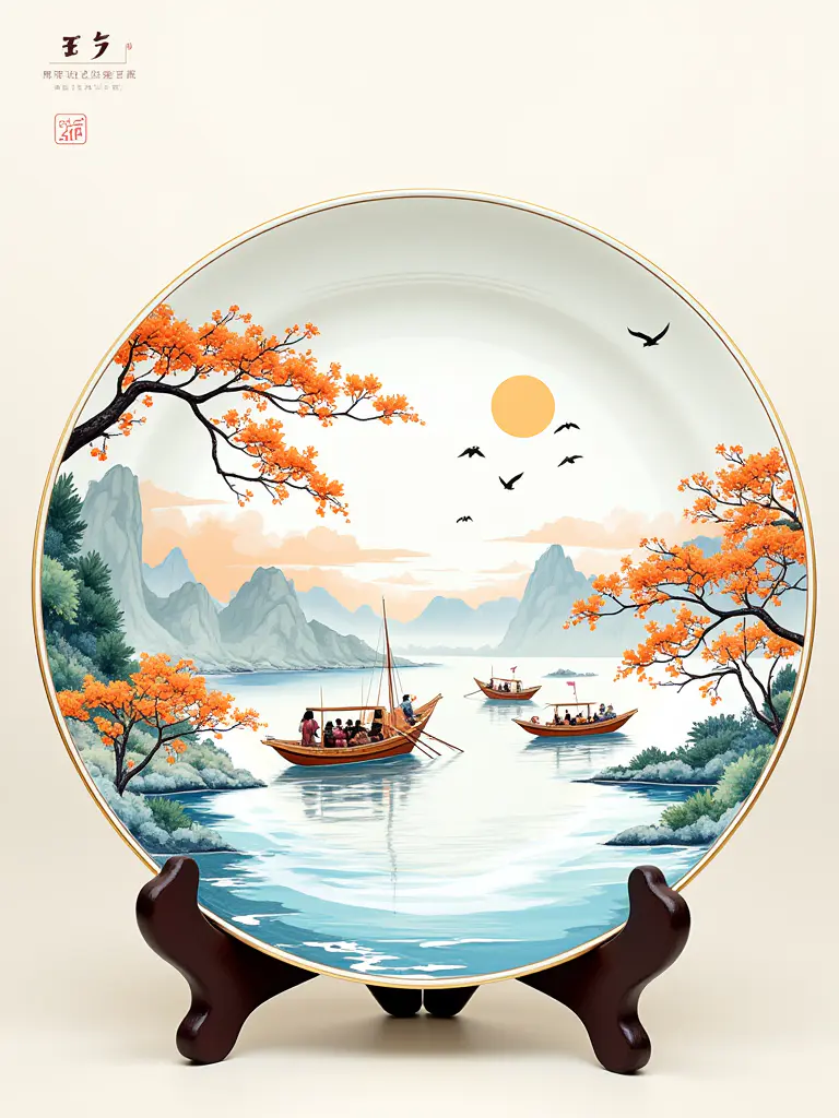 浙江楠溪江渔舟唱晚瓷盘,一块充满诗意的瓷盘,上面绘有浙江楠溪江的渔舟唱晚与阿克苏博斯腾湖的渔歌互答,是两地水乡风情的生动描绘。图案包括楠溪江的渔舟、渔火、晚霞、阿克苏的博斯腾湖、芦苇、水鸟、以及两地共有的宁静与美好。采用粉彩瓷工艺,它显得柔美细腻,每一处色彩都柔和而富有层次感。瓷盘配有一个竹制支架,8K画质下,逆光展现瓷盘的温润与光泽,微距捕捉图案中每一处细腻的笔触与色彩变化。