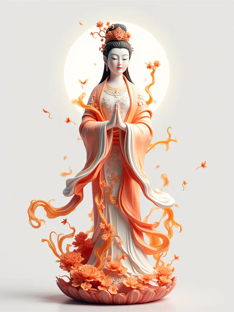 浙江普陀山观音瓷像,一尊慈悲庄严的观音瓷像,底座上雕刻有浙江普陀山的海天佛国景象与阿克苏的神秘峡谷风光,是两地自然与信仰的和谐共生。瓷像面容慈祥,身姿优雅,底座图案包括普陀山的南海观音、紫竹林、阿克苏的峡谷奇石、飞瀑流泉、以及两地共有的宁静祥和。采用高温瓷工艺,它显得晶莹剔透,每一处雕刻都栩栩如生。瓷像配有一个红木底座,8K画质下,逆光展现瓷像的圣洁与光泽,微距捕捉底座上每一处精美的雕刻细节。