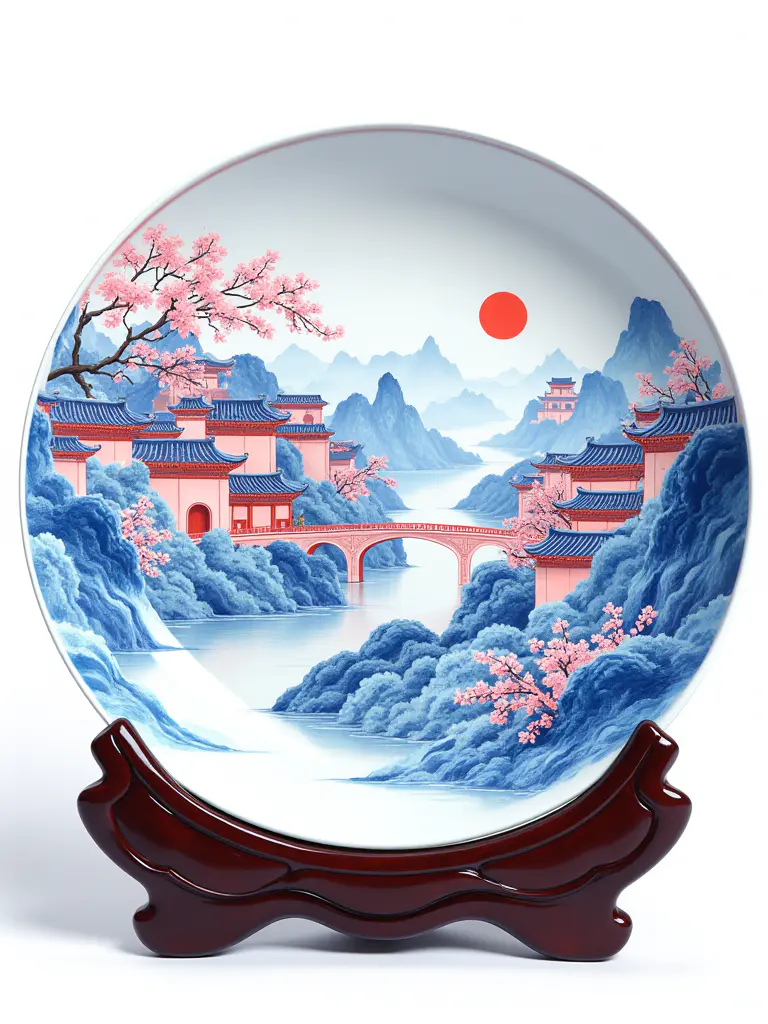 浙江西塘古镇瓷盘,一块充满历史韵味的瓷盘,上面绘有浙江西塘古镇的粉墙黛瓦与阿克苏古城遗址的沧桑风貌,是两地历史文化的深刻体现。图案包括西塘的古桥、流水、人家、阿克苏的古城墙、烽火台、以及两地共有的历史沉淀与文化底蕴。采用青花瓷工艺,它显得古朴典雅,每一处图案都透露出岁月的痕迹。瓷盘配有一个红木支架,8K画质下,逆光展现瓷盘的温润与光泽,微距捕捉图案中每一处精美的细节与色彩搭配。