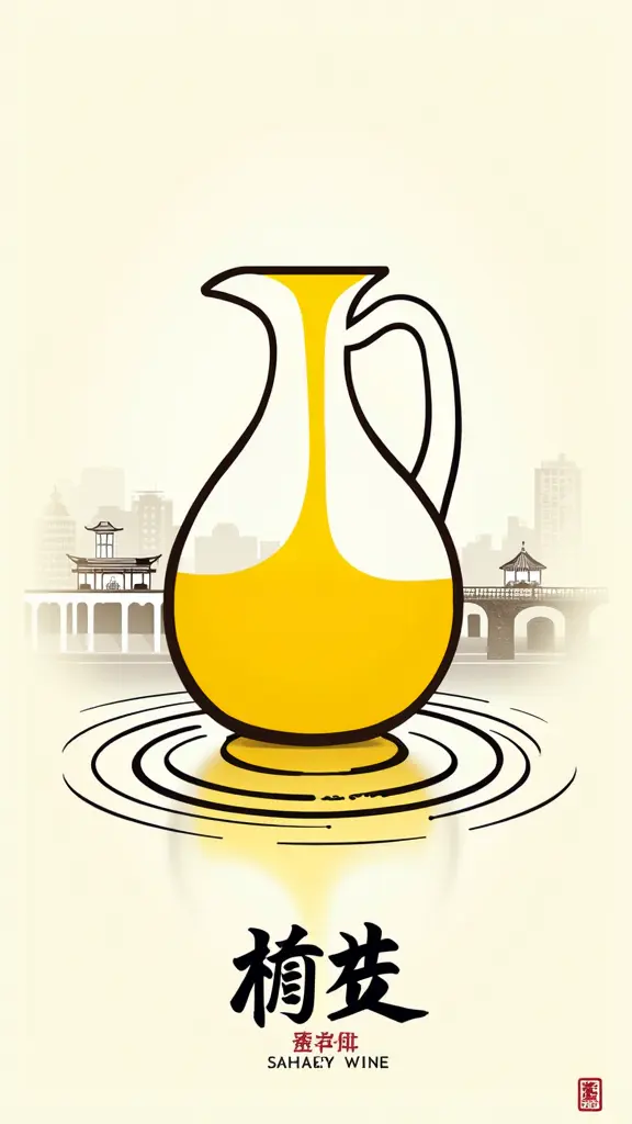 ◦ 主体是酒器轮廓(融合花瓶与酒壶形态),黑色线条简洁现代,壶嘴流出的黄色酒液形成涟漪,直观体现黄酒特质。