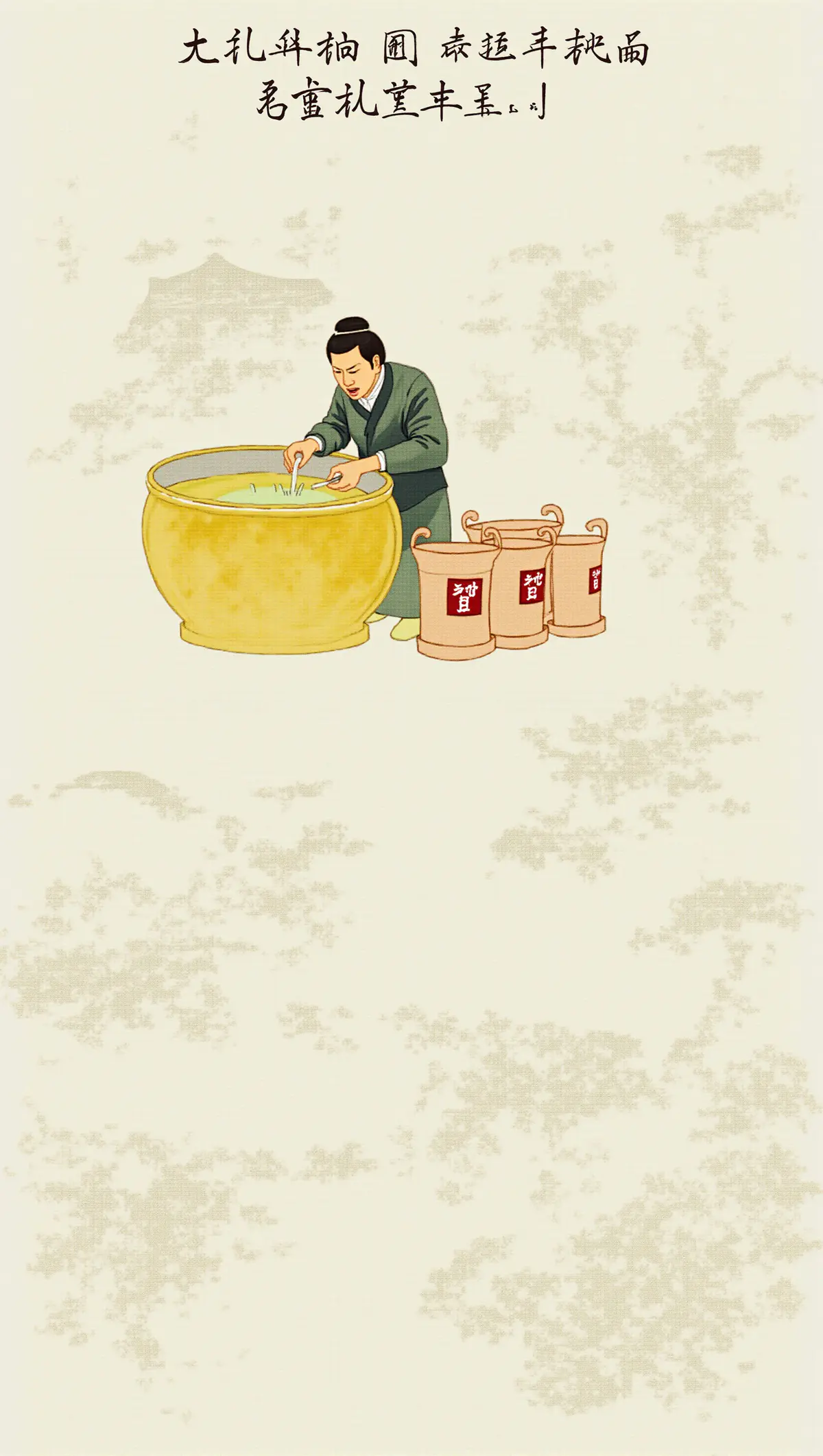 ◦ 前景是黄酒酿造场景:身着传统服饰的匠人在大缸前忙碌,进行酿酒工序;旁边摆放着多只贴有“酒”字红标的酒坛,直观呈现黄酒的酿造过程。