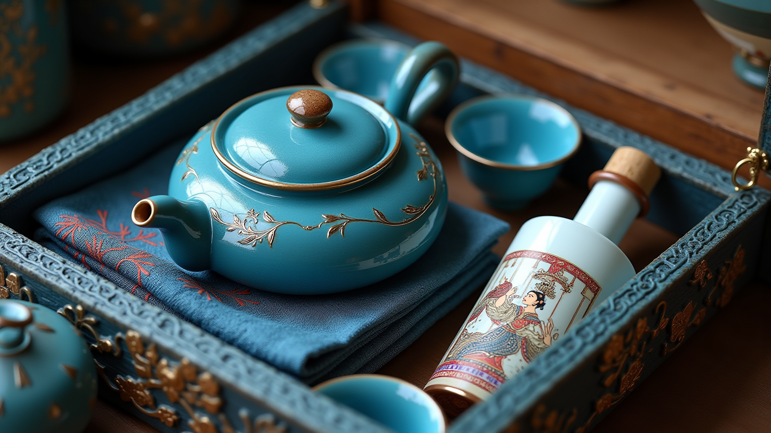 这套茶器以浙江龙泉青瓷为基底,取其标志性的天青色釉面,搭配鎏金缠枝纹(融入浙江传统纹饰美学);茶器盒身的浮雕工艺与内衬的蓝调织纹,呼应杭州丝绸的质感肌理。