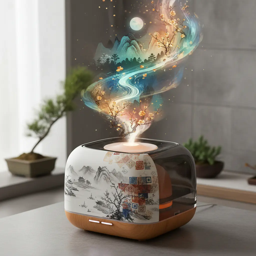 新中式智能香氛机,流线型机身融合江南水墨与龟兹壁画,散发浙八味中药与阿克苏果香的混合气息,香气可视化为一幅流动的光影山水,极简设计,宁静科技感--ar16:9