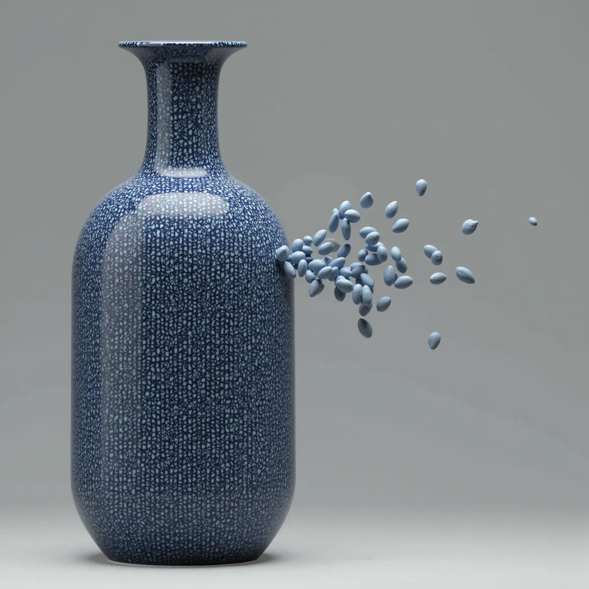 生成融合浙阿非遗元素的数字雕塑:主体是“青瓷瓶身+阿克苏木雕肌理”的组合形态——瓶身是浙江青瓷的冰裂纹质感,瓶体雕刻阿克苏木雕的“葡萄纹+胡杨纹”,同时加入动态特效:瓶身会缓缓流转浙江丝绸的锦缎光泽,瓶口飘出模拟浙江黄酒香气的数字粒子特效。
