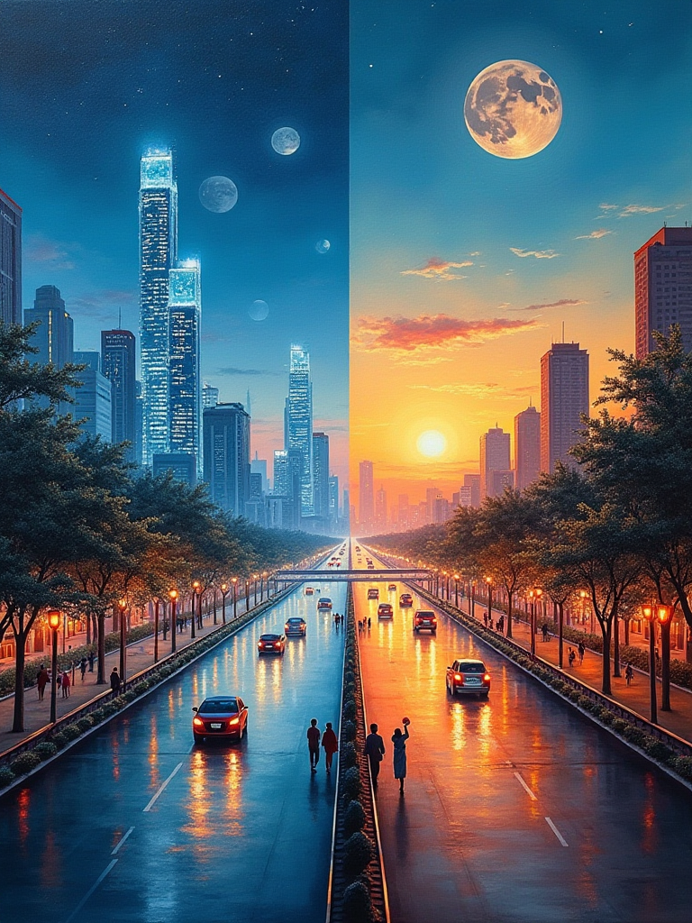 创作一幅融合浙江与阿克苏现代城市风貌的画作,具体构思如下:此幅画作将浙江杭州钱江新城的现代繁华与阿克苏阿克苏市的蓬勃发展生动呈现,左侧描绘钱江新城高楼林立、灯光璀璨的都市夜景;右侧则展现阿克苏市街道宽敞整洁、...查看更多