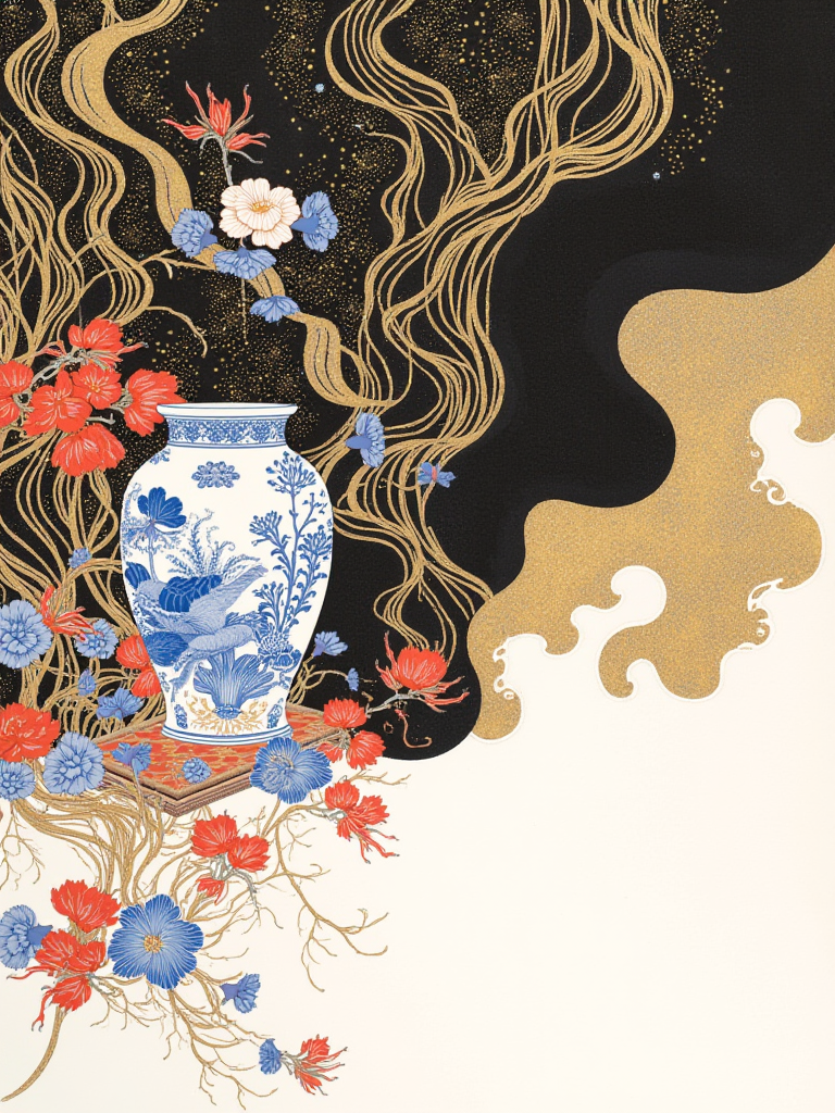插画,钢笔画,版画,极简主义,by James Jean。作品名称定为《丝路文韵·浙阿和鸣》。画面主体采用钢笔画细腻勾勒浙江的龙泉青瓷与阿克苏的柯尔克孜族刺绣纹样,两者以流动的丝绸线条缠绕交织,象征文化交融。版画技法处理背景中的桑皮纸纹理,与前景形成虚实对比,黑色底纹上若隐若现的《诗经》与《玛纳斯》诗句,以烫金工艺呈现。画面右下角保留大面积留白,仅以一抹大漠孤烟与江南烟雨的抽象色块收束,整体营造出电影《英雄》式的史诗感与东方美学意境。