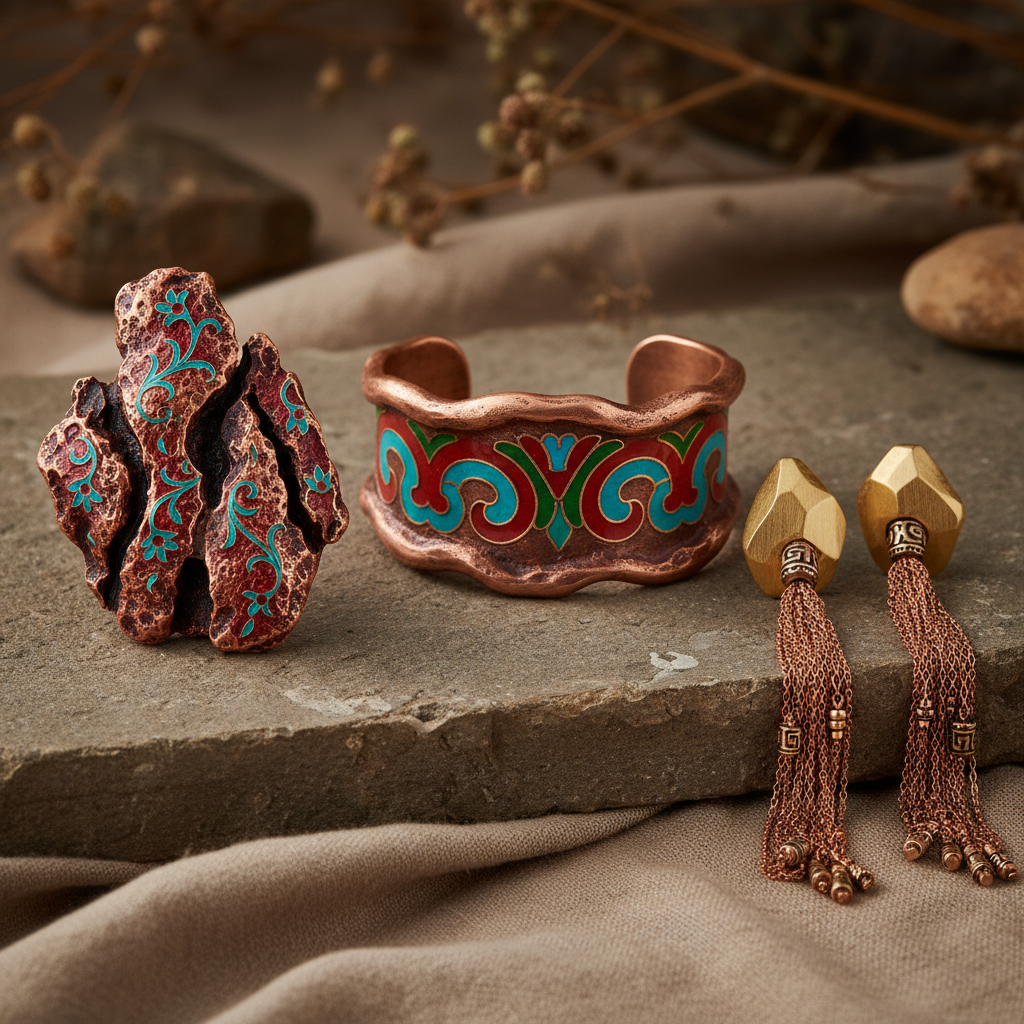 **Subject:** A high-end editorial still-life photography shot displaying a coherent jewelry collection consisting of three distinct items: a brooch, a wide bangle, and a pair of earrings. **Item 1 (The Brooch):** Placed on the left, an artistic brooch featuring an organic, eroded copper texture (Zhu Bingren style) resembling a desert rock, with intricate crimson and turquoise enamel inlays mimicking Kyrgyz floral embroidery inside the metal crevices. **Item 2 (The Bangle):** Placed in the center, a wide cuff bangle made of aged red copper with a fluid, molten lava texture. It features geometric Kyrgyz sheep-horn patterns rendered in vibrant cloisonné enamel (red, green, blue), contrasting with the rough oxidized metal. **Item 3 (The Earrings):** Placed on the right, a pair of mismatched asymmetrical earrings. One is a geometric gold nugget; the other is a long cascading tassel made of ultra-fine copper chains with micro-engraved ethnic beads at the tips. **Composition & Background:** T