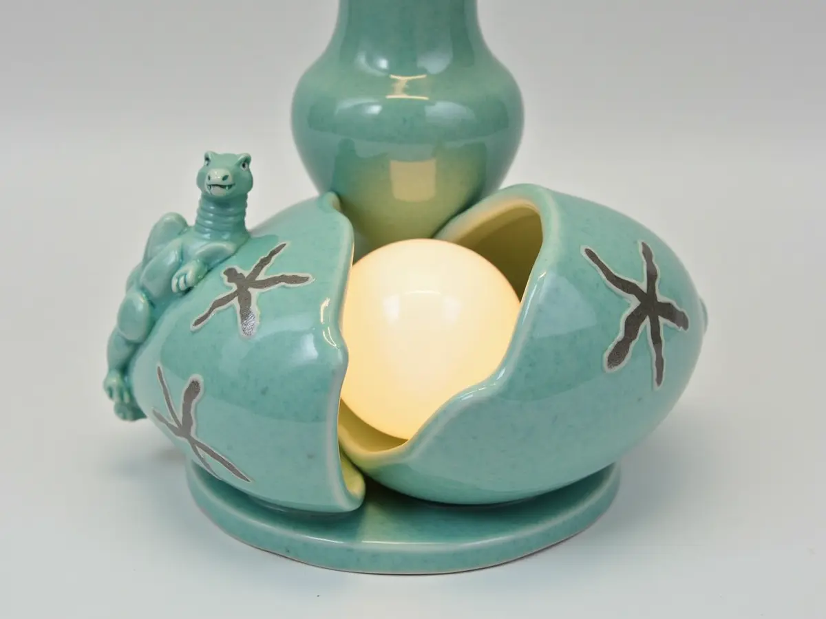 这盏台灯以青瓷釉色塑造 “破卵” 的趣味形态,浅青质感自带清雅古韵。裂开的蛋卵壳上绘着深灰海星纹饰,既添了几分海洋氛围感,又与青瓷底色形成柔和层次;一侧伏着的青瓷骆驼,则让器物多了份灵动的 “陪...查看更多