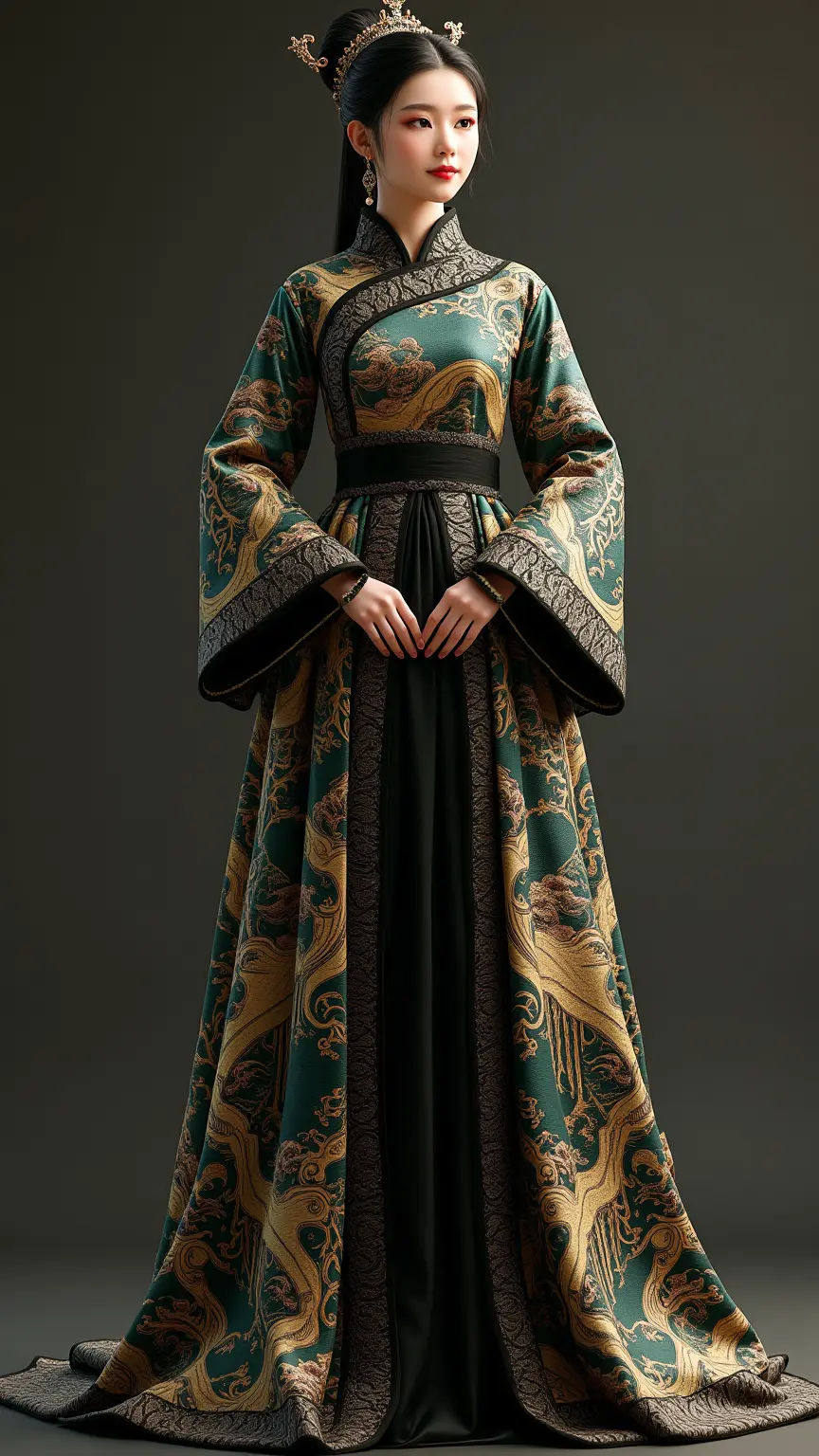 (马面裙结构,前后平整马面裙片,仅两侧打褶,不是全裙褶皱,宽幅黑色系带腰头,及地长裙) , (精细凤凰纹样,山水云纹,枝叶纹理,黑底青绿金色配色,中国传统装饰元素) , (织锦缎面料,光泽感强,挺括又飘逸) , (中式汉服风格,典雅精致,写实渲染,8K分辨率,超高细节,棚拍光影)