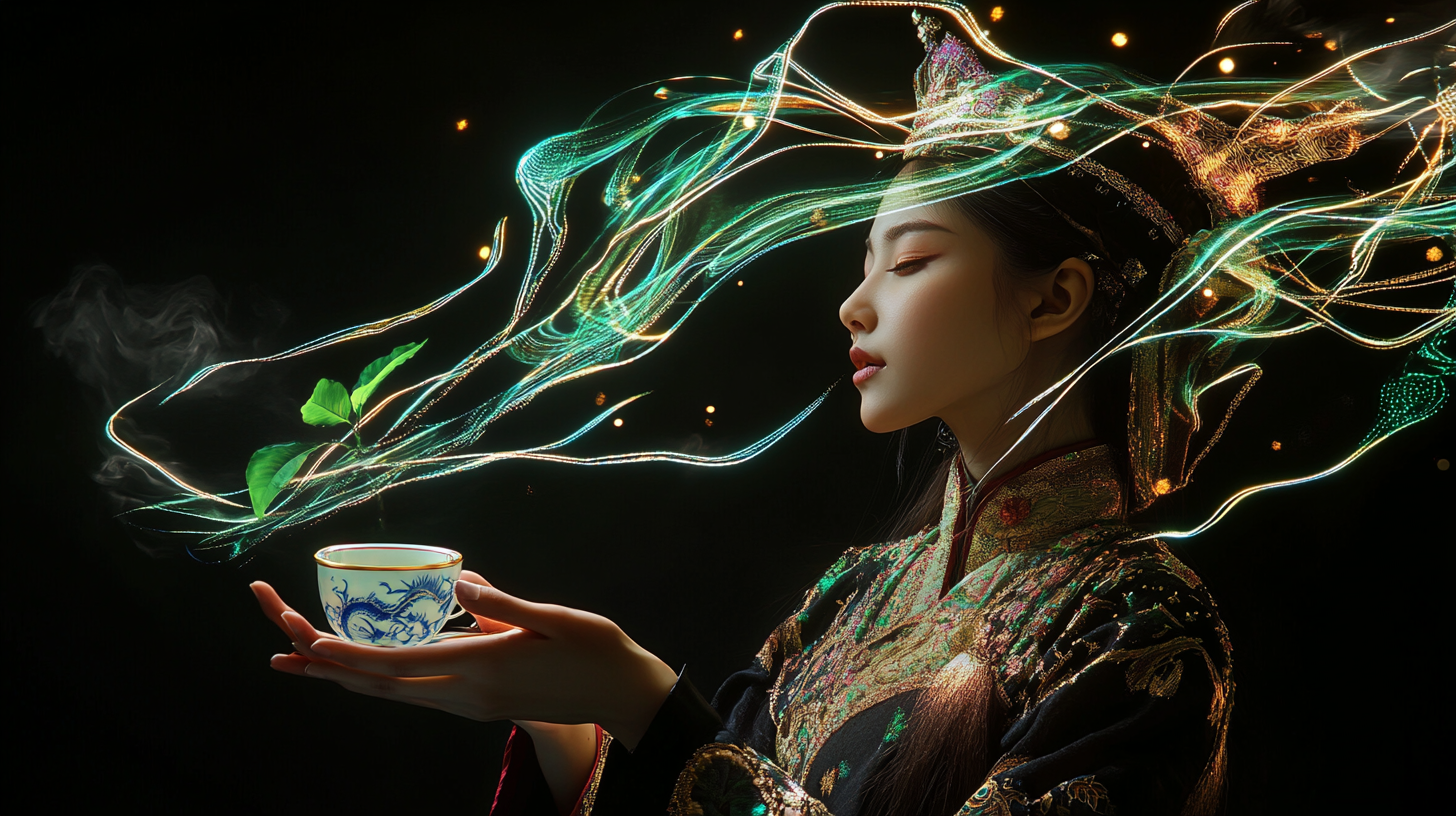 茶的润、瓷的雅与裳的纹,在暗调背景中借光带串联,既显江南物产与非遗的温婉,又藏阿克苏地区传统工艺的鲜活,以诗意画面串联跨区域文化元素