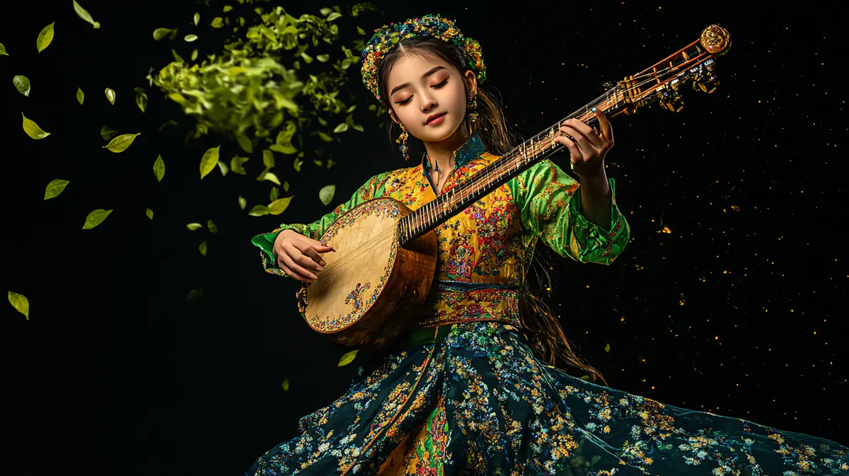 以 “跨区域文化共创” 为核心,身着民族服饰的表演者轻拨弦音,四周江南绿茶芽随乐声舒展,让江南茶韵与新疆弦音在画面中相融,以灵动的视觉联动,诠释 “不同地域文化同根同源、共生共美” 的大赛主题