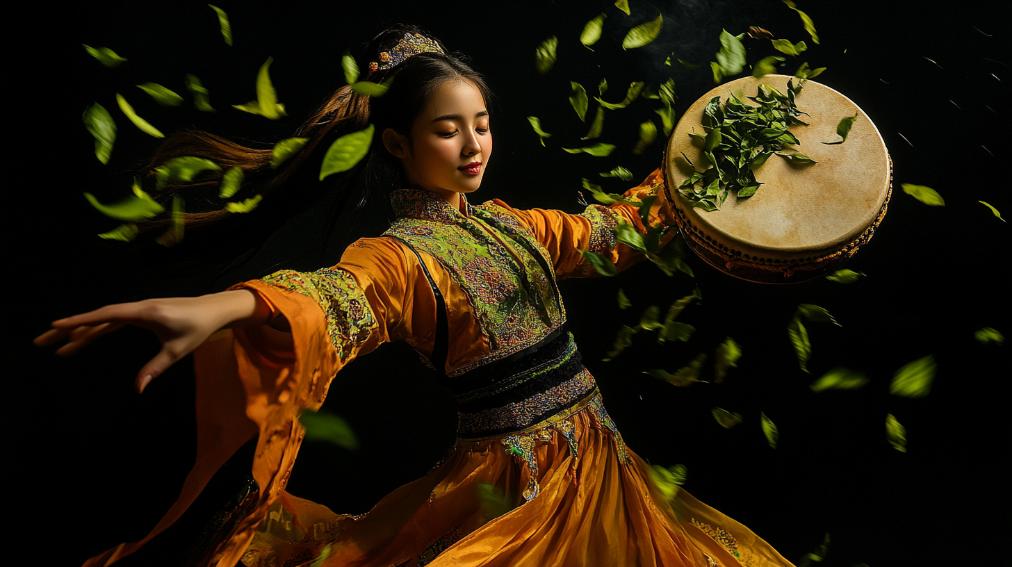 身着民族服饰的舞者,以传统打击乐器达甫为引舒展舞姿,江南绿茶芽随明快鼓点轻扬流转,让茶韵与非遗在动态中相融