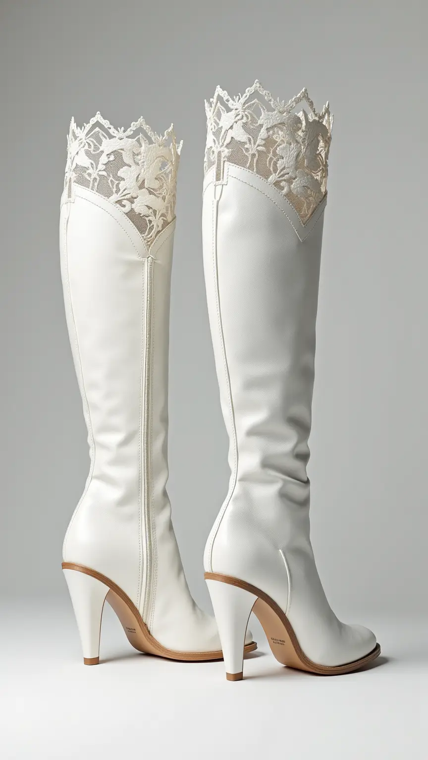 一双白色及膝长筒靴,带裂纹纹理的手工蕾丝,花型边缘自然毛边,网眼疏密渐变,光线穿透时高光聚在毛边;哑光车缝皮革,包边处0.3厘米白色明线(边缘微褶皱),表面带毛孔纹理;靴筒垂直高约等于42厘米,顶部弧形收口;跟面宽3.2厘米(梯形收窄),底部浅木色,跟面边缘1毫米做旧磨损;弧度半径1.8厘米的小方头,前端圆润过渡;左侧四十五度柔光,左侧渐变光影,蕾丝高光加百分之二十,皮革阴影加百分之三十;地面浅灰磨砂,投影长为靴筒一半;整体风格法式复古轻魅惑感,背景纯浅灰;廉价亮面, 钝头, 鞋跟歪斜, 蕾丝过密/过疏, 背景杂, 卡通, 过度磨皮。