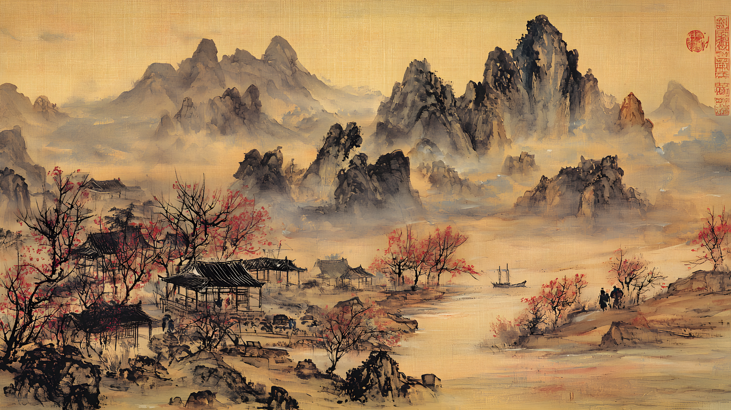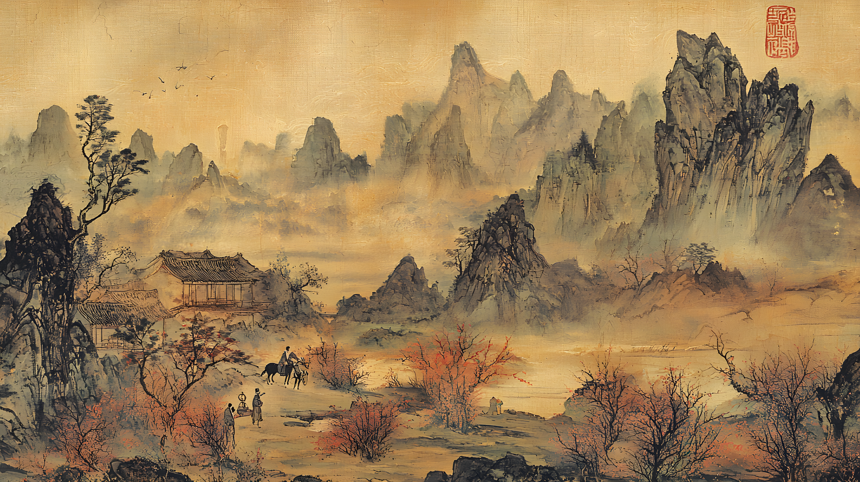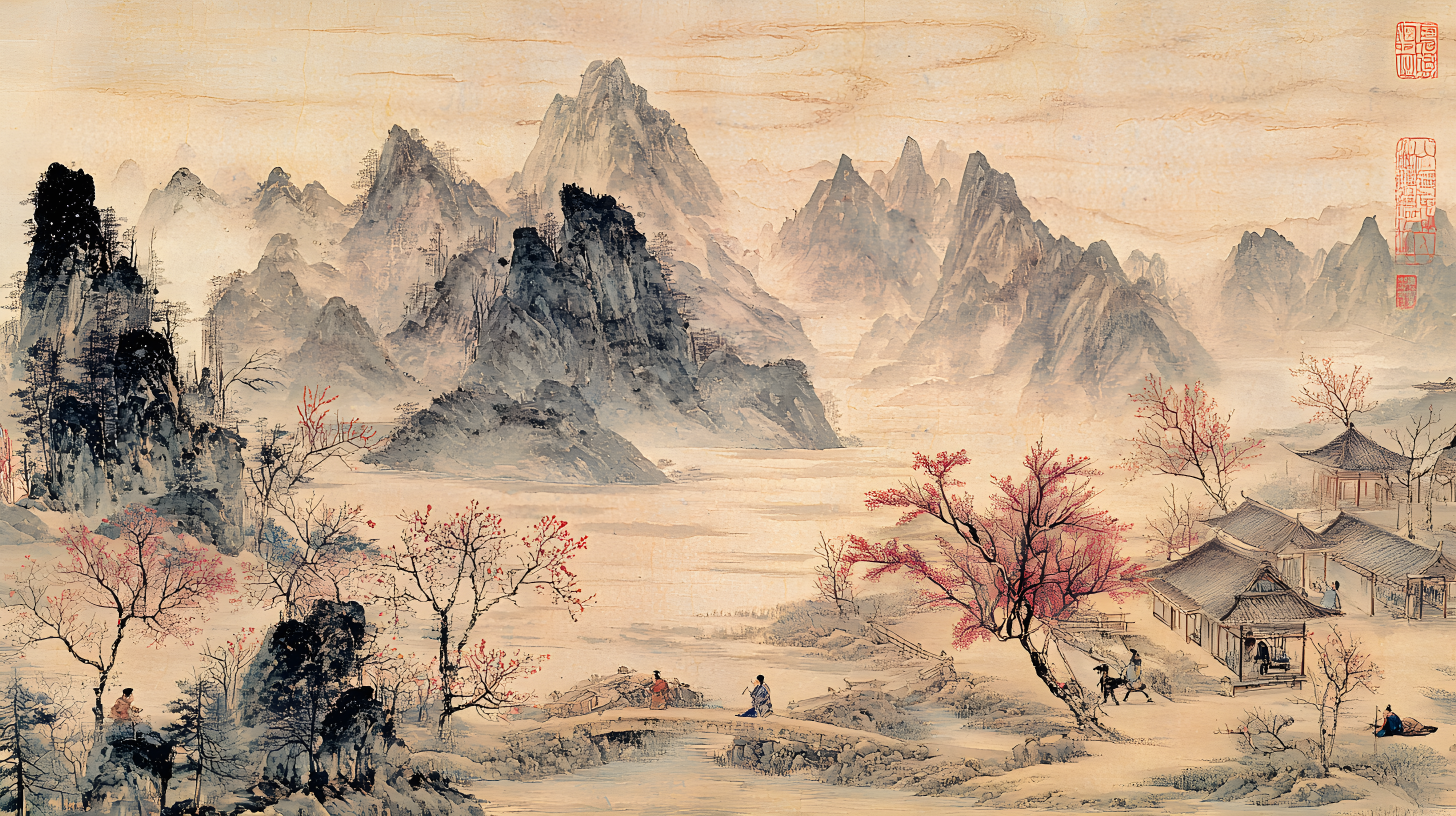 近景中,红梅花开、红梅花上积满了雪花,文人逸士与家仆骑马郊游,在松林间策马扬鞭,结伴郊游的场景,茅屋里穿插有序,松树下有两个文士策马而行,结伴到郊外游玩,一边挥鞭纵马,一边高声吟诗,追逐山林间的走兽;疲惫时就在树下小憩,把盏饮酒,谈经论道,笑着招呼林间的飞鸟前来同饮。