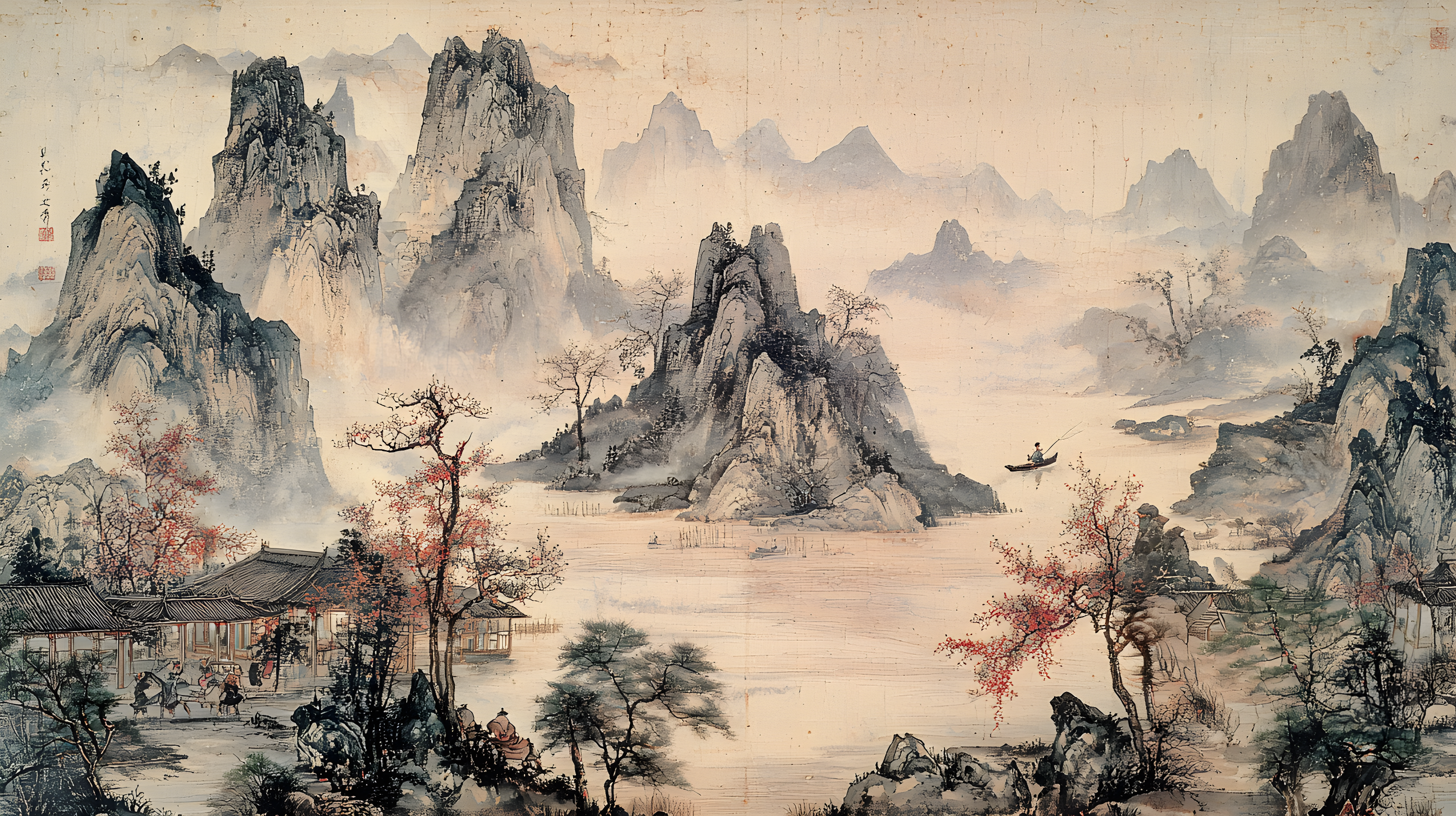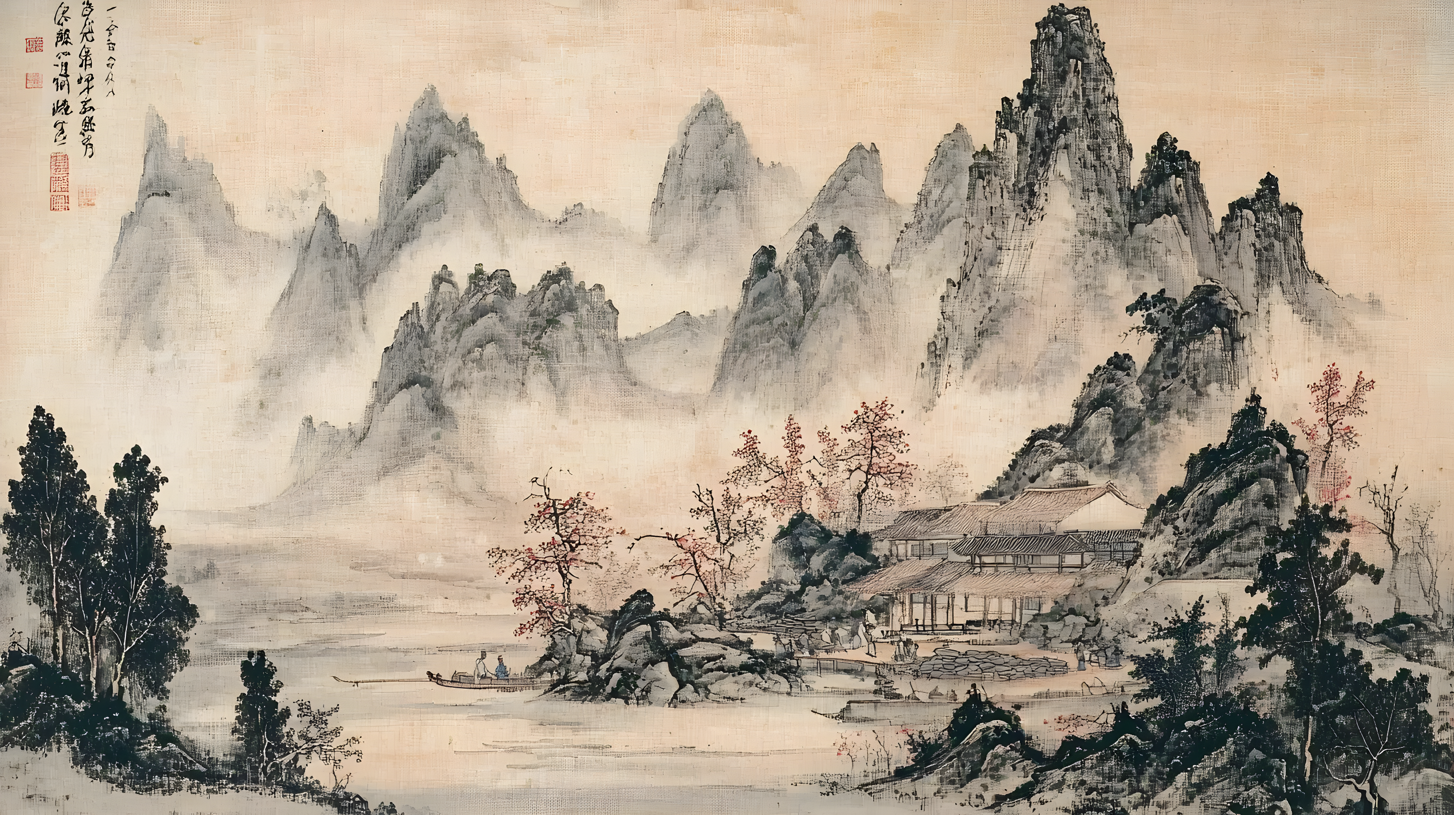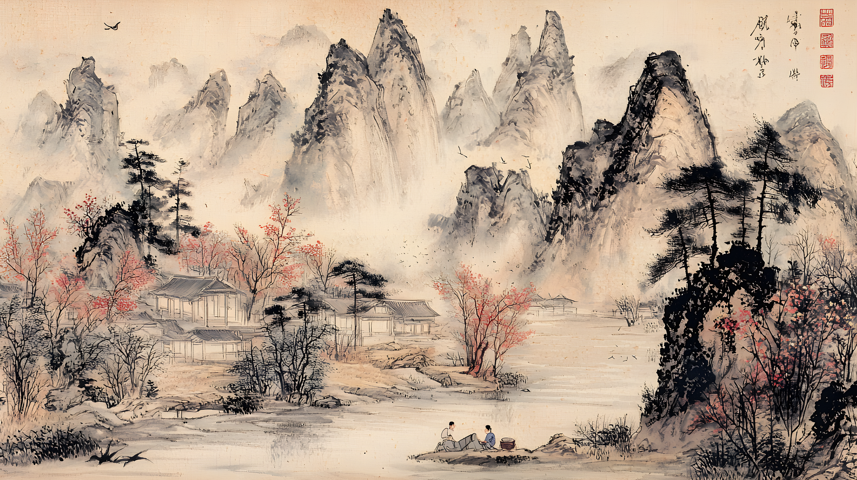 中景画,水面上波光粼粼,一名渔父正摇橹靠岸;江岸上是一片疏朗的杂树林,几间简陋的茅舍掩映在丹枫之间,一间稍大的茅屋里,两名老者正席地而坐,促膝交谈,稍小的茅屋内,一名童子正在侍弄茶灶,为主人烹煮新茶。