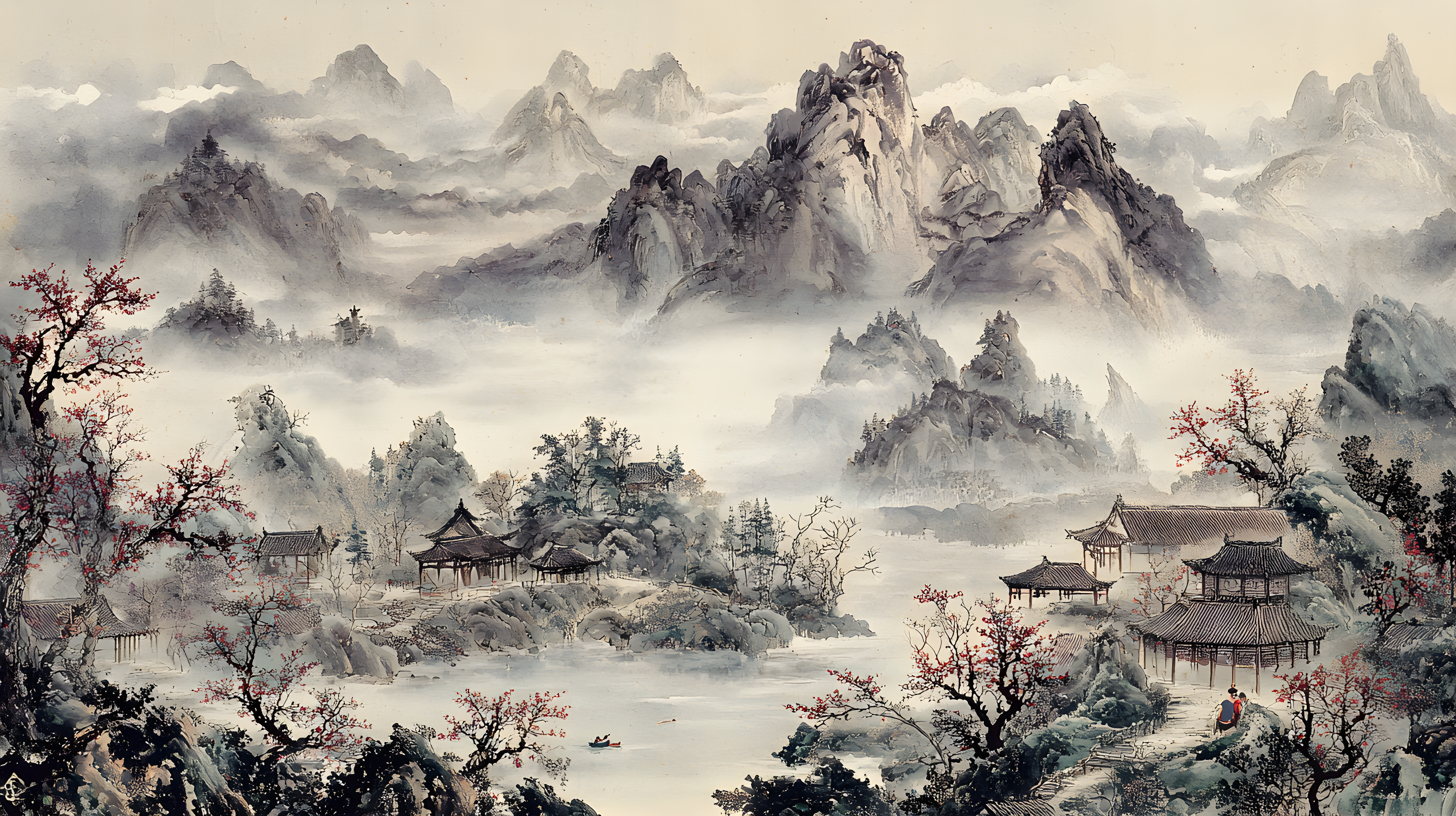 远景中陡峭的山峰如泰山压顶,画面中,峻峭的山峰、盘曲的山道、急湍的危桥以及葱郁的林木构成了一幅生动的自然景观,山势雄峻,石质坚峭,皴法斧劈,笔法劲健,墨色淋漓。画中以水墨提炼形象,墨韵明净、生趣盎然,云山峭立,悬崖高耸,琼阁隐现,