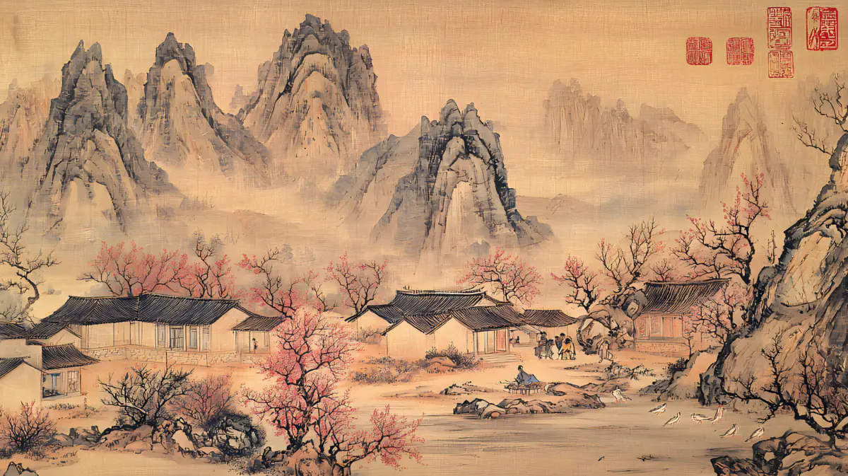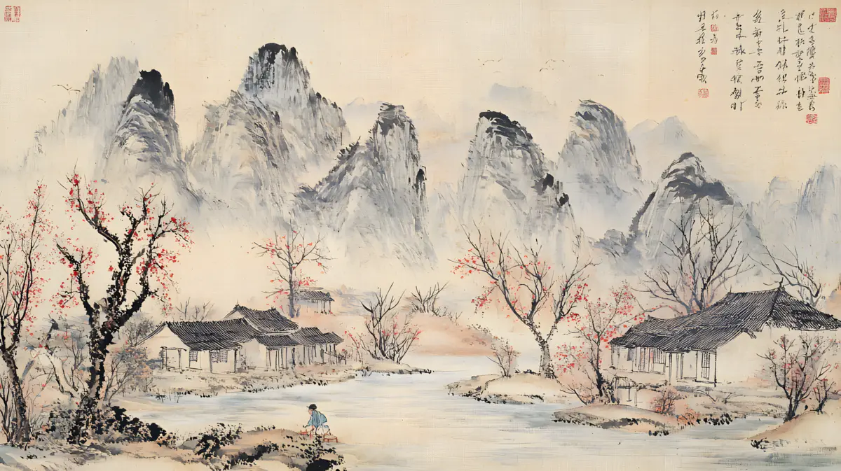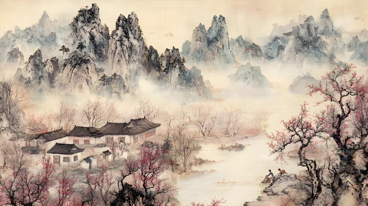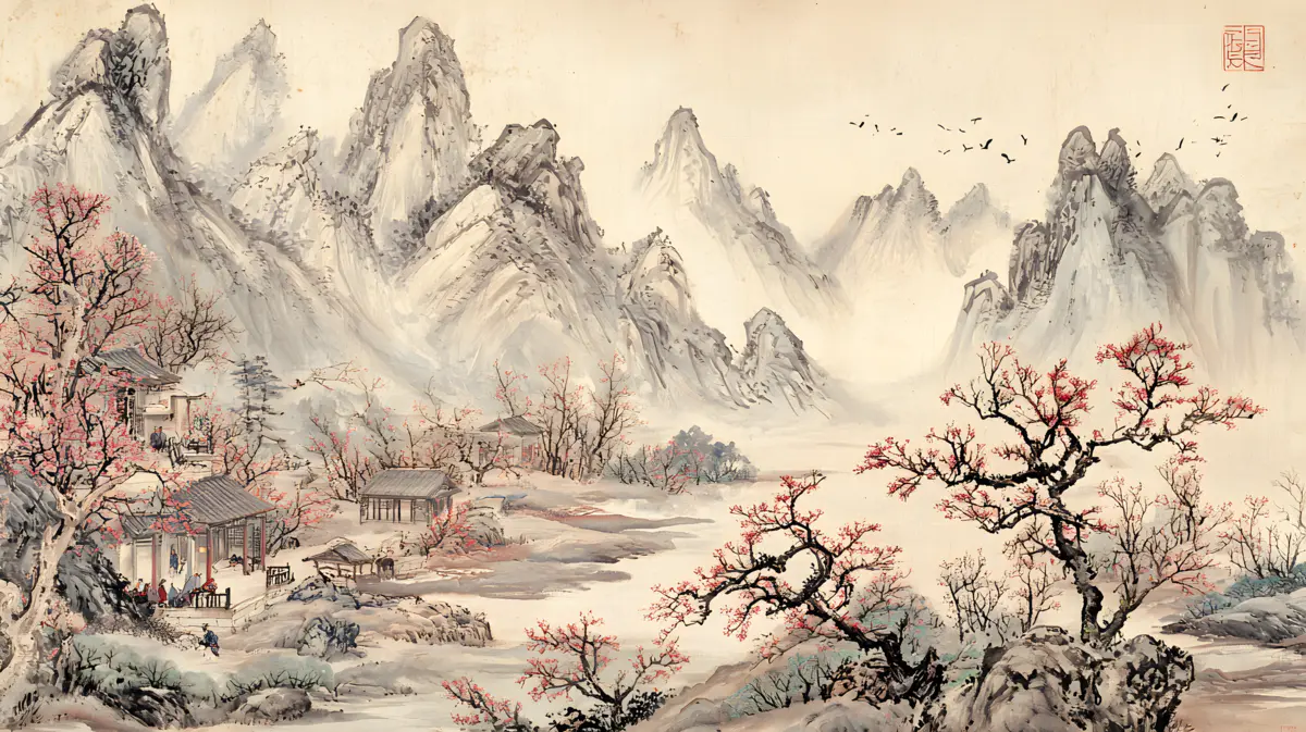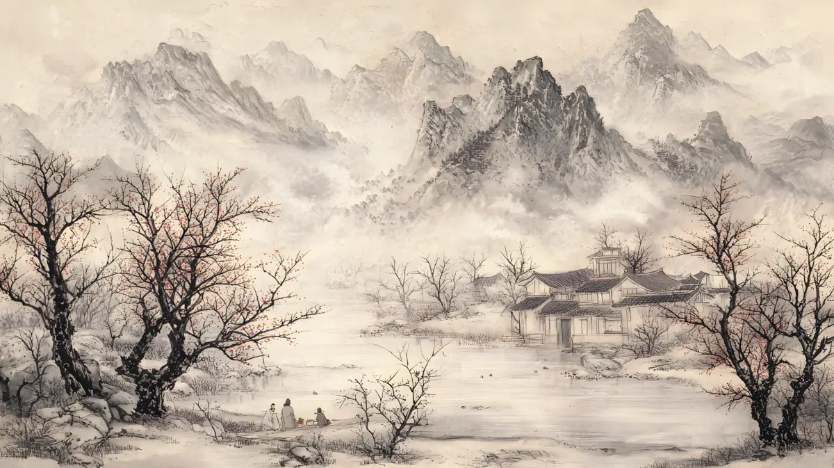 近景中,红梅花开、红梅花上积满了雪花,文人逸士与家仆骑马郊游,在松林间策马扬鞭,结伴郊游的场景,茅屋里穿插有序,松树下有两个文士策马而行,结伴到郊外游玩,一边挥鞭纵马,一边高声吟诗,追逐山林间的走兽;疲惫时就在树下小憩,把盏饮酒,谈经论道,笑着招呼林间的飞鸟前来同饮。