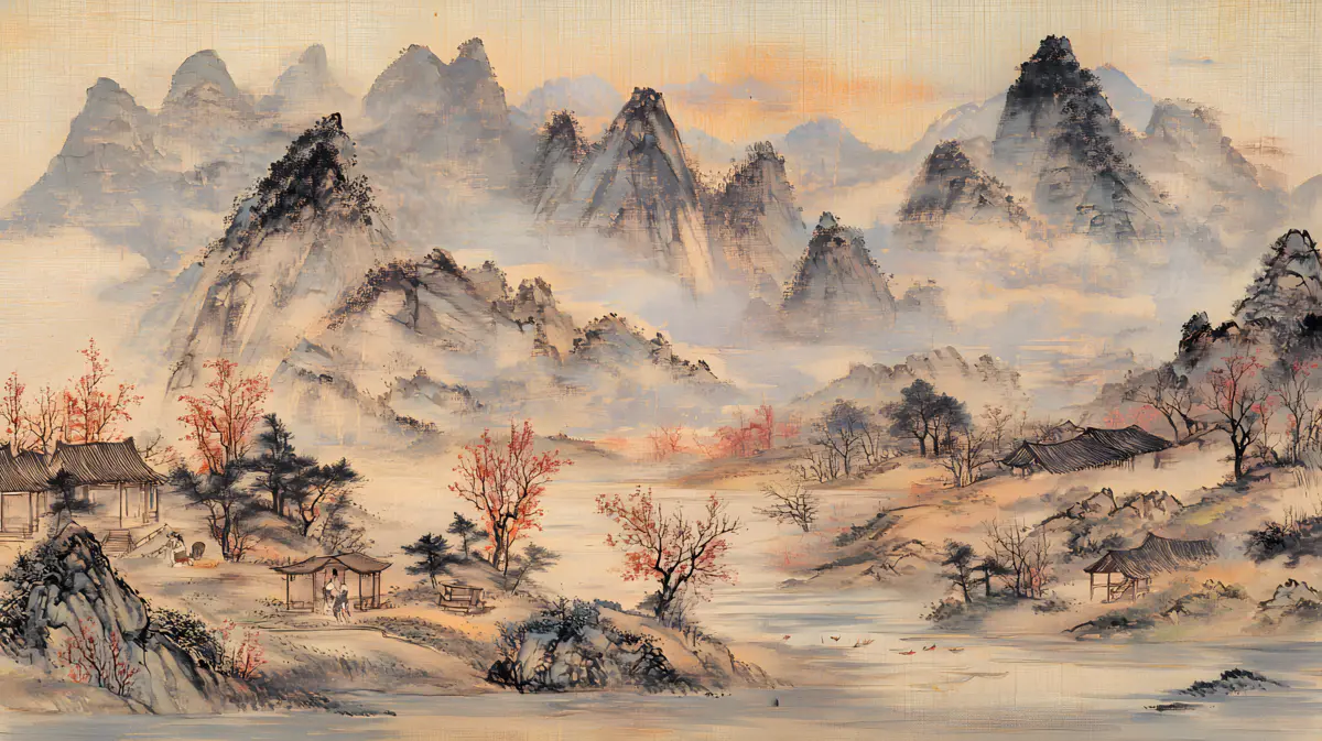 中景画,水面上波光粼粼,一名渔父正摇橹靠岸;江岸上是一片疏朗的杂树林,几间简陋的茅舍掩映在丹枫之间,一间稍大的茅屋里,两名老者正席地而坐,促膝交谈,稍小的茅屋内,一名童子正在侍弄茶灶,为主人烹煮新茶。