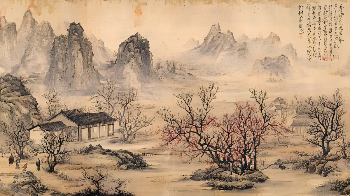 早春的山林中,红梅花开, 远景与近景相互呼应,形成层次分明的视觉效果。