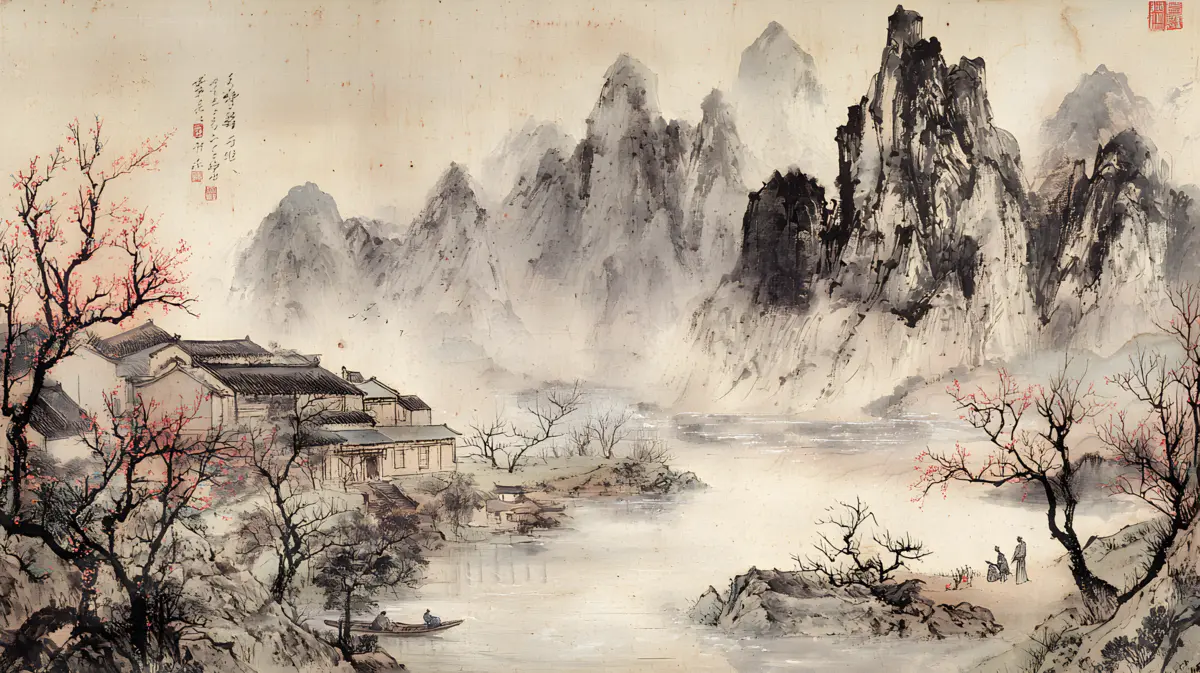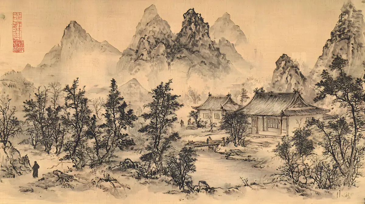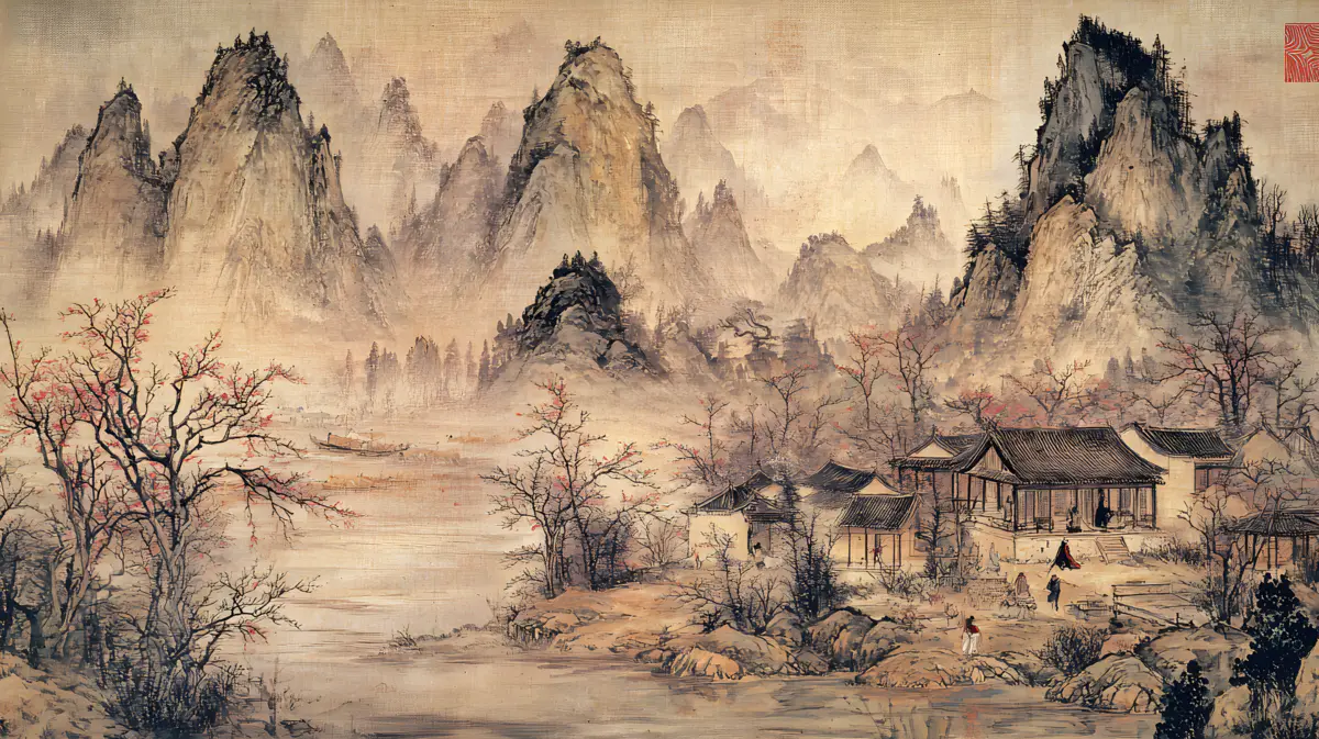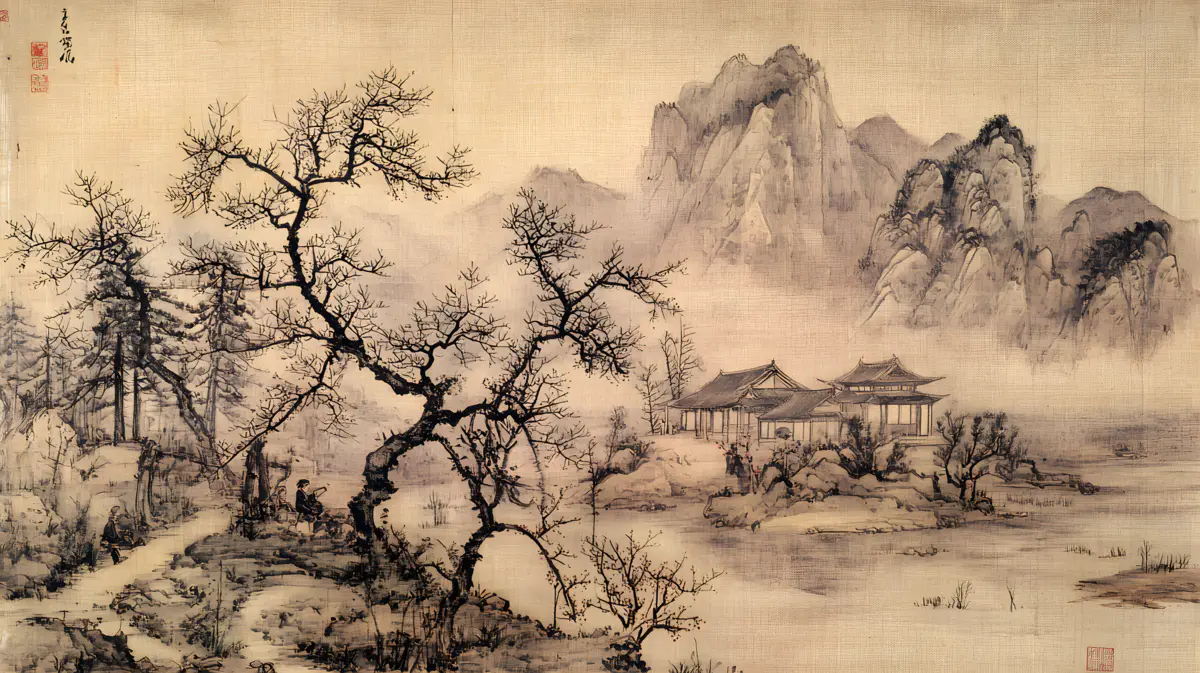 近景中,红梅花开、文人逸士与家仆骑马郊游,在松林间策马扬鞭,结伴郊游的场景,茅屋里穿插有序,松树下有两个文士策马而行,结伴到郊外游玩,一边挥鞭纵马,一边高声吟诗,追逐山林间的走兽;疲惫时就在树下小憩,把盏饮酒,谈经论道,笑着招呼林间的飞鸟前来同饮。