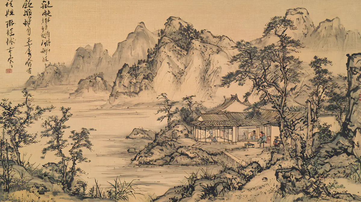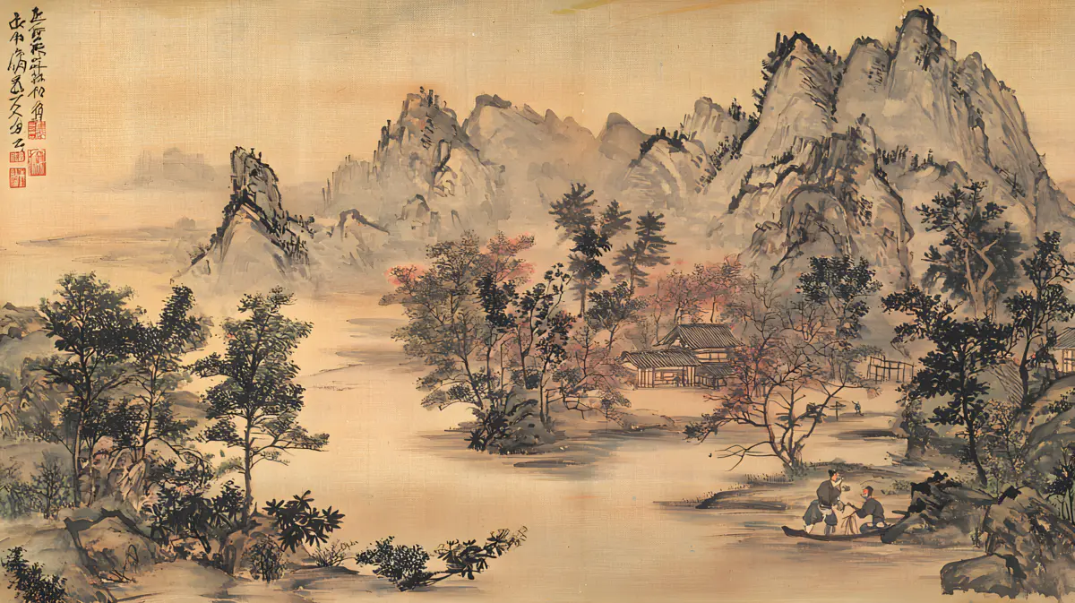 中景画,水面上波光粼粼,一名渔父正摇橹靠岸;江岸上是一片疏朗的杂树林,几间简陋的茅舍掩映在丹枫之间,一间稍大的茅屋里,两名老者正席地而坐,促膝交谈,稍小的茅屋内,一名童子正在侍弄茶灶,为主人烹煮新茶。