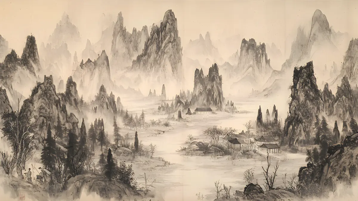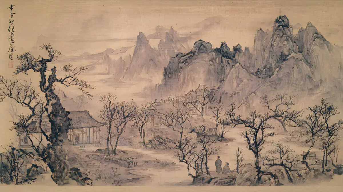 唐寅绘画风格,画面布局严谨整饬,造型真实生动,山势雄峻,石质坚峭,皴法斧劈,笔法劲健,墨色淋漓,充分展现了作者山水画的独特风格。