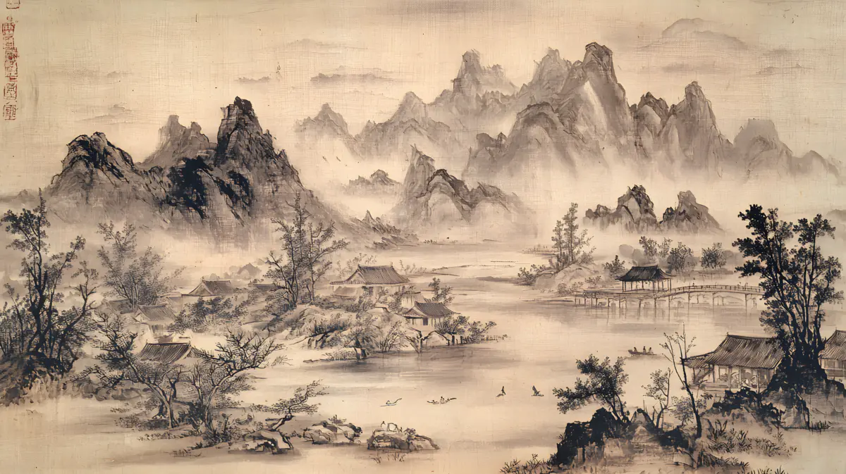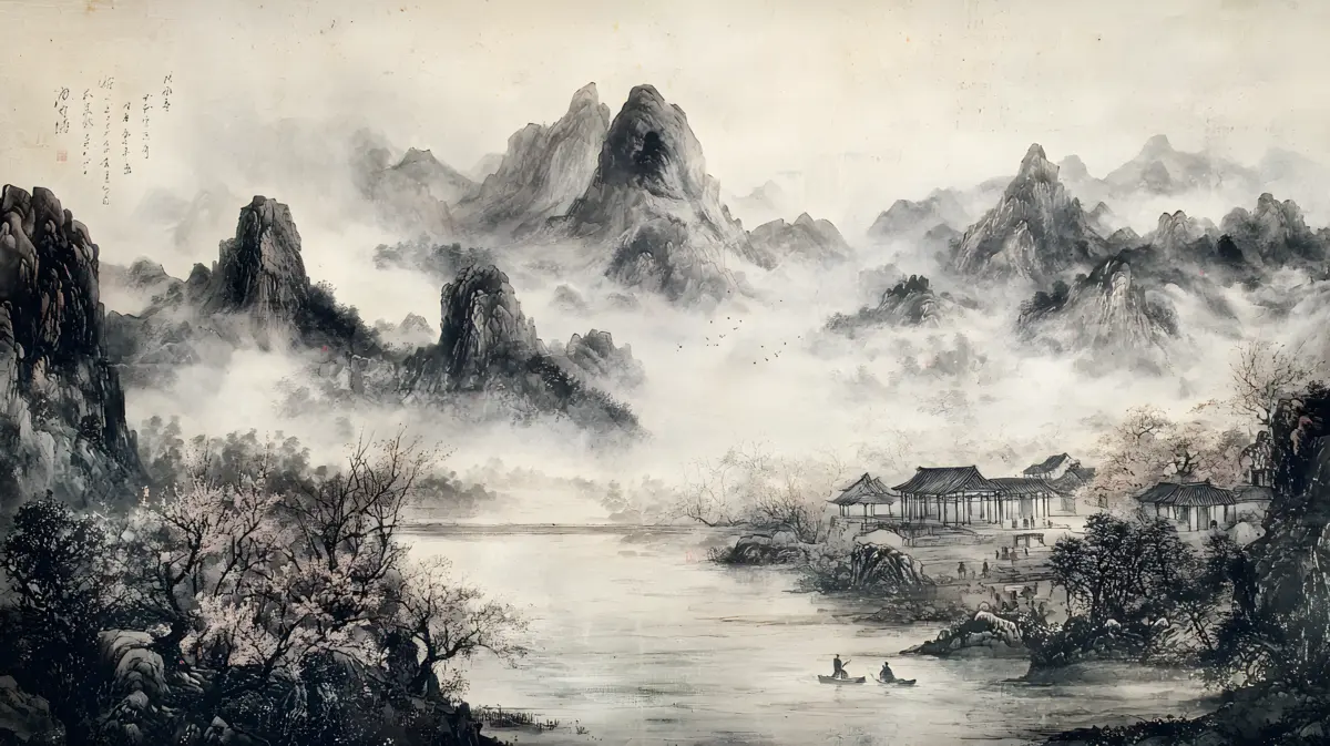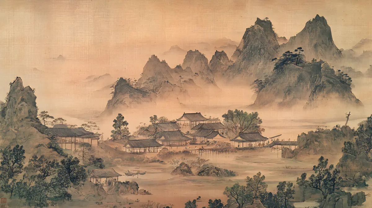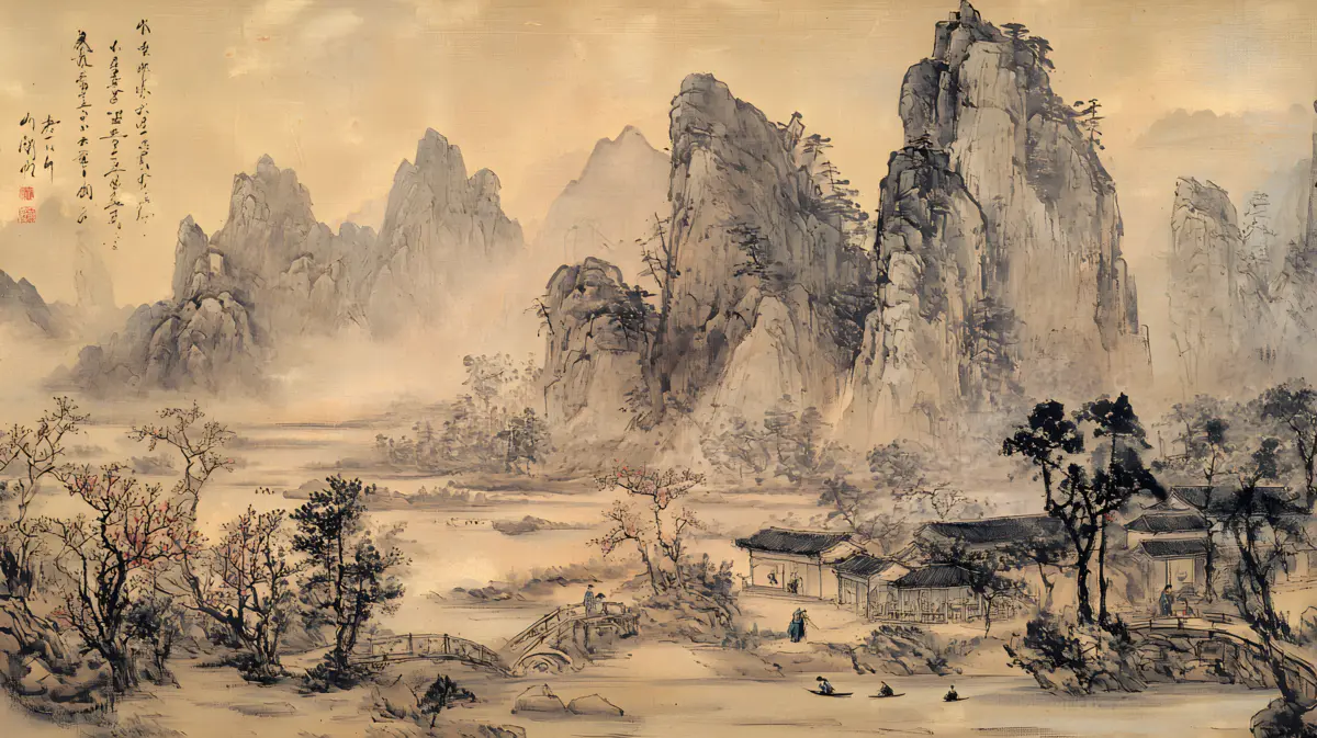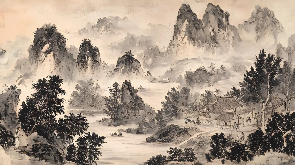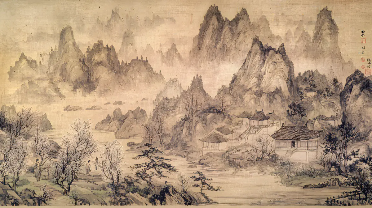 唐寅绘画风格,画面布局严谨整饬,造型真实生动,山势雄峻,石质坚峭,皴法斧劈,笔法劲健,墨色淋漓,充分展现了作者山水画的独特风格。