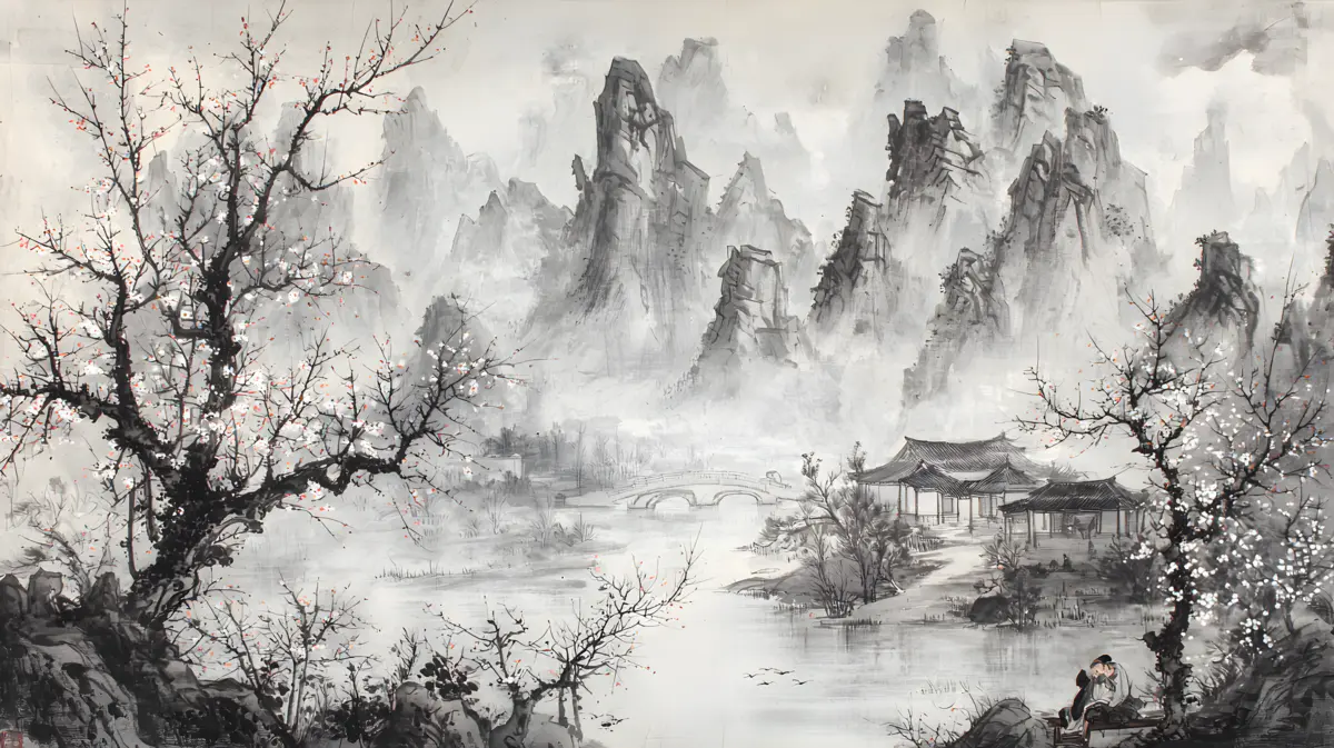 早春的山林中,红梅花开, 远景与近景相互呼应,形成层次分明的视觉效果。