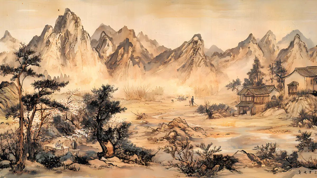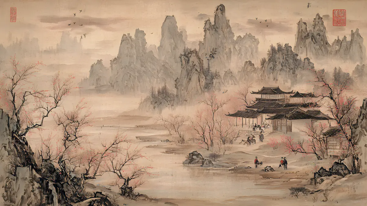 近景中,红梅花开、文人逸士与家仆骑马郊游,在松林间策马扬鞭,结伴郊游的场景,茅屋里穿插有序,松树下有两个文士策马而行,结伴到郊外游玩,一边挥鞭纵马,一边高声吟诗,追逐山林间的走兽;疲惫时就在树下小憩,把盏饮酒,谈经论道,笑着招呼林间的飞鸟前来同饮。