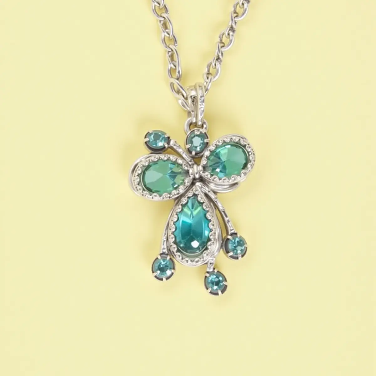 在淡黄色的背景下,一条银色链条上挂着银制蝴蝶结吊坠,吊坠上镶嵌着硕大宝石,宝石焕发着鲜艳的蓝色光芒