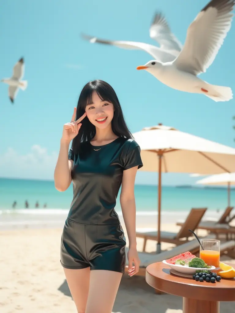 Ultra wide angle lens, a beautiful Asian woman with black hair on the beach by the sea, wearing black shiny leather short-sleeved top and black leather shorts, right index finger pointing forward to the camera, left thumb against cheek and four fingers spread outward, mouth slightly open, beige sunshade and beach lounge chair on the right side of the frame, a wooden round table next to the lounge chair with a fruit plate filled with watermelon, mango, blueberry, pitaya and a glass of gradient orange-red juice, one seagull flying past the character in the foreground, one seagull flying towards the character in the sky, one seagull soaring in the distance, the connection between the beach and the sea on the left extends inward to the right at an inclined angle, blue sky and blue sea, delicate sand, bright and transparent light and shadow, delicate and shiny skin texture, realistic style, 8K ultra-high definition, extreme detail.nsfw=75