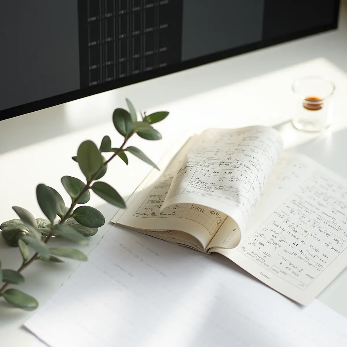 极简ins风书桌俯拍,一张写满数学公式的复古纸张微微褶皱,旁边放着燃尽的香薰蜡烛与半杯咖啡,晨光从窗边斜照在凌乱的草稿纸上,形成柔和光影。角落有一台打开的笔记本电脑屏幕显示着复杂图表,整体色调为低饱和度灰粉+雾霾蓝,风格带有生活感学习博主桌面摄影,画面宁静而有故事感。