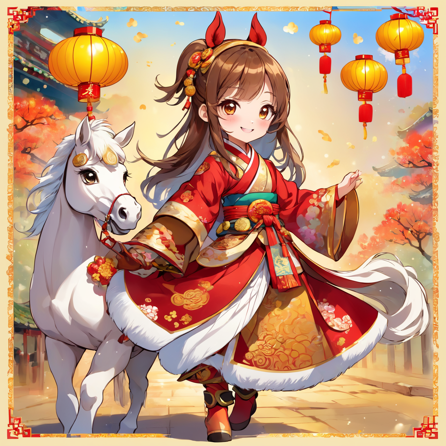 彩漫风格,马年主题少女吉祥物,16岁左右元气甜妹,五官精致灵动,杏眼弯成月牙,笑容灿烂,头顶一对毛茸茸的白色马耳,发尾染成渐变金棕色,身着改良款马面裙样式的短裙,裙身绣有金色奔马图案,外搭一件红色短款唐装外套,袖口点缀白色绒毛,腰间系着铜钱纹腰带,脚踩红色马丁靴,左手举着写有“马到成功”的红色小春联,右手抱着一只系着红绳的迷你小马公仔,背景是暖黄色调的新年集市一角,灯笼高挂,飘着零星雪花,画面线条锐利流畅,色彩鲜明活泼,赛璐璐画风,层次分明,适合作为吉祥物海报素材