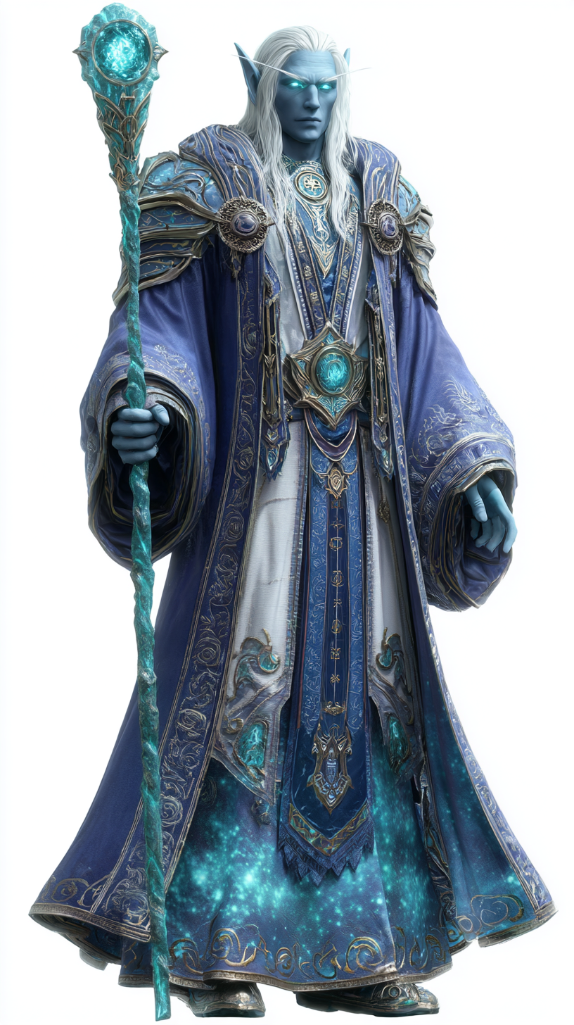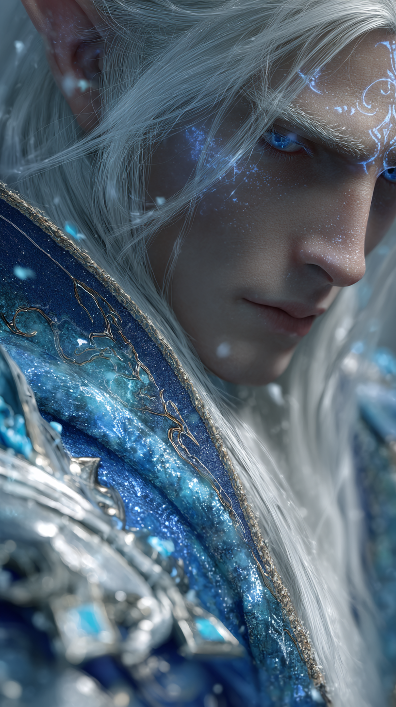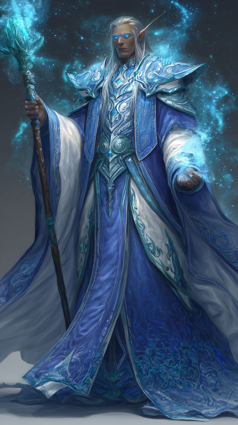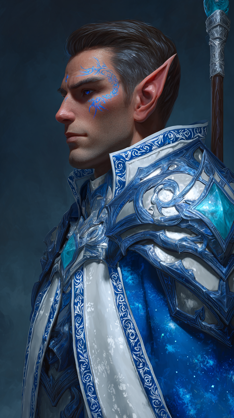 大师级作品,壁纸级画质,极致细节的插画画风精灵全身照,面相俊朗,高鼻深目,十分英俊而贵气的脸庞,五官很精致,有着蓝色的眼睛,脸上印着发光的符文,穿着魔兽世界画风带有护甲的法袍,法袍是蓝色的缎子状,镶边上有魔法符文,袍子表面似乎流转着星云,披着高等精灵风格的蓝白两色华丽斗篷,手握一根似乎是青金石做成的法杖,似乎是法师