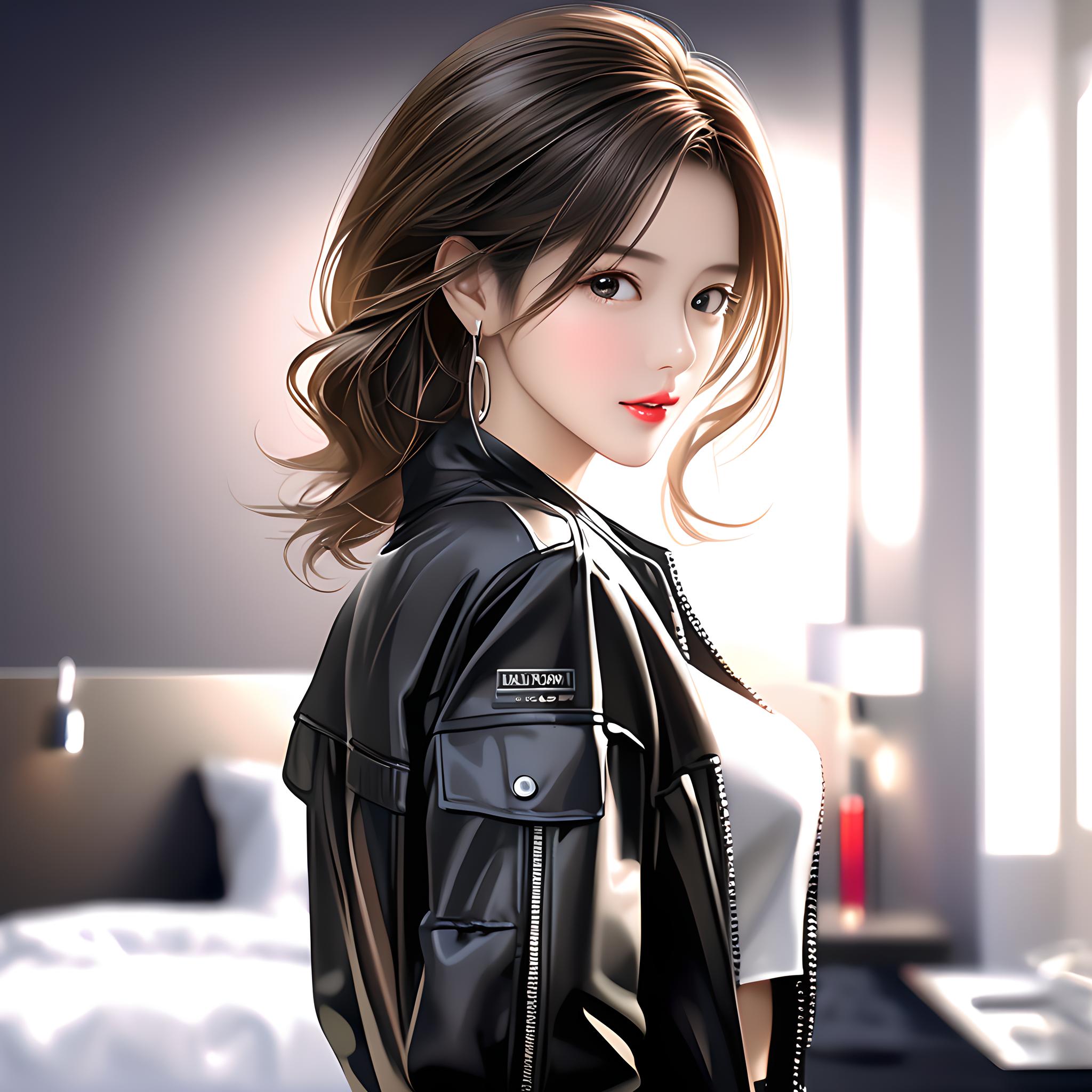 1335822:34发布编辑封面标题20主观视角镜头(男性视角),8K超高清分辨率,巨幕现代电影质感,高动态范围 (HDR),精准色彩还原,高对比度明暗对比布光,细腻光影层次。一位自信女性,立于氛围感昏暗的卧室,床头灯透出暖金色轮廓光勾勒身形,身着修身黑色皮夹克(匹配参考图穿搭风格)。全程保持上半身特写。镜头以中近景起幅,聚焦她的胸口与双手:她突然猛地攥住夹克拉链,利落快速脱下夹克。拉链滑落的瞬间,镜头动态前推追拍她的脸庞:她直视镜头,眼神锐利又魅惑,下巴高傲扬起,脸颊微微泛红。她带着玩味的笑意挑逗"你想要我吗?"(文字以柔和叠加形式呈现),随即轻轻吻上镜头(留下一抹红唇印)。画面定格在她占满全屏的脸庞,渐隐至黑