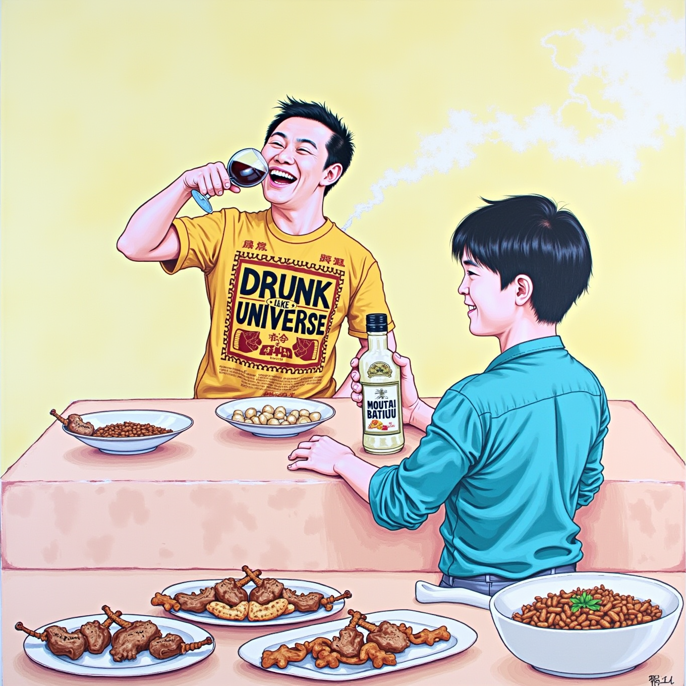厚涂见笔触:一位身穿“醉如人生”黄色广告衫的汉子端着酒杯
