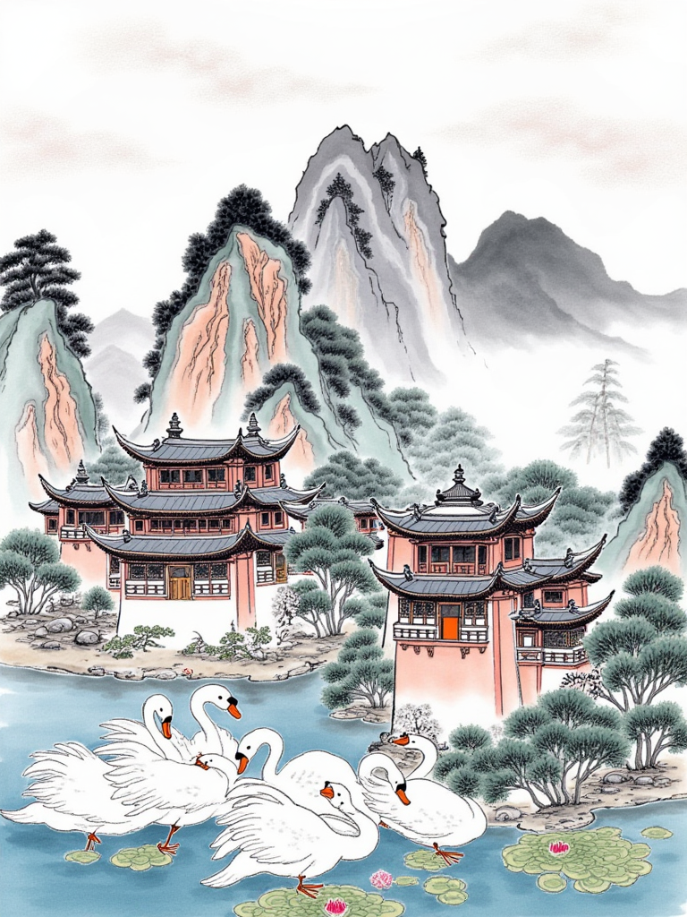 中式水墨,现代插画,空灵氛围,烟雨山峦,