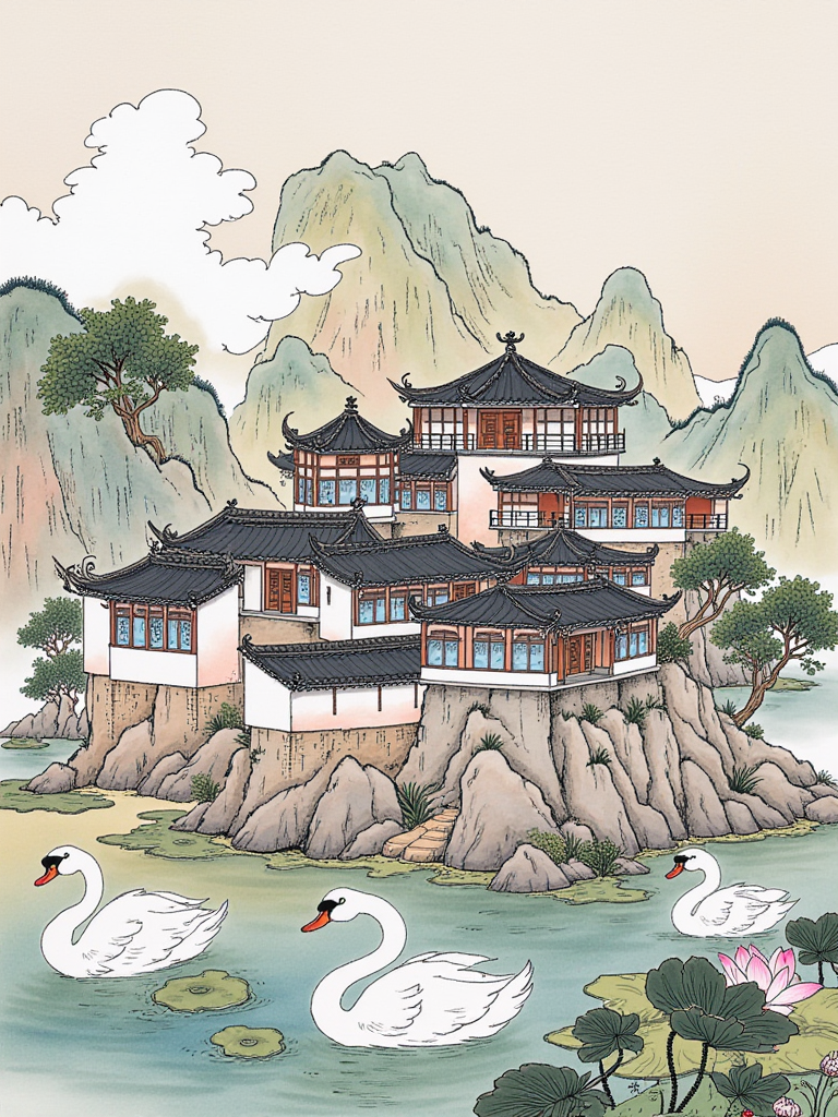 中式水墨,现代插画,空灵氛围,烟雨山峦,