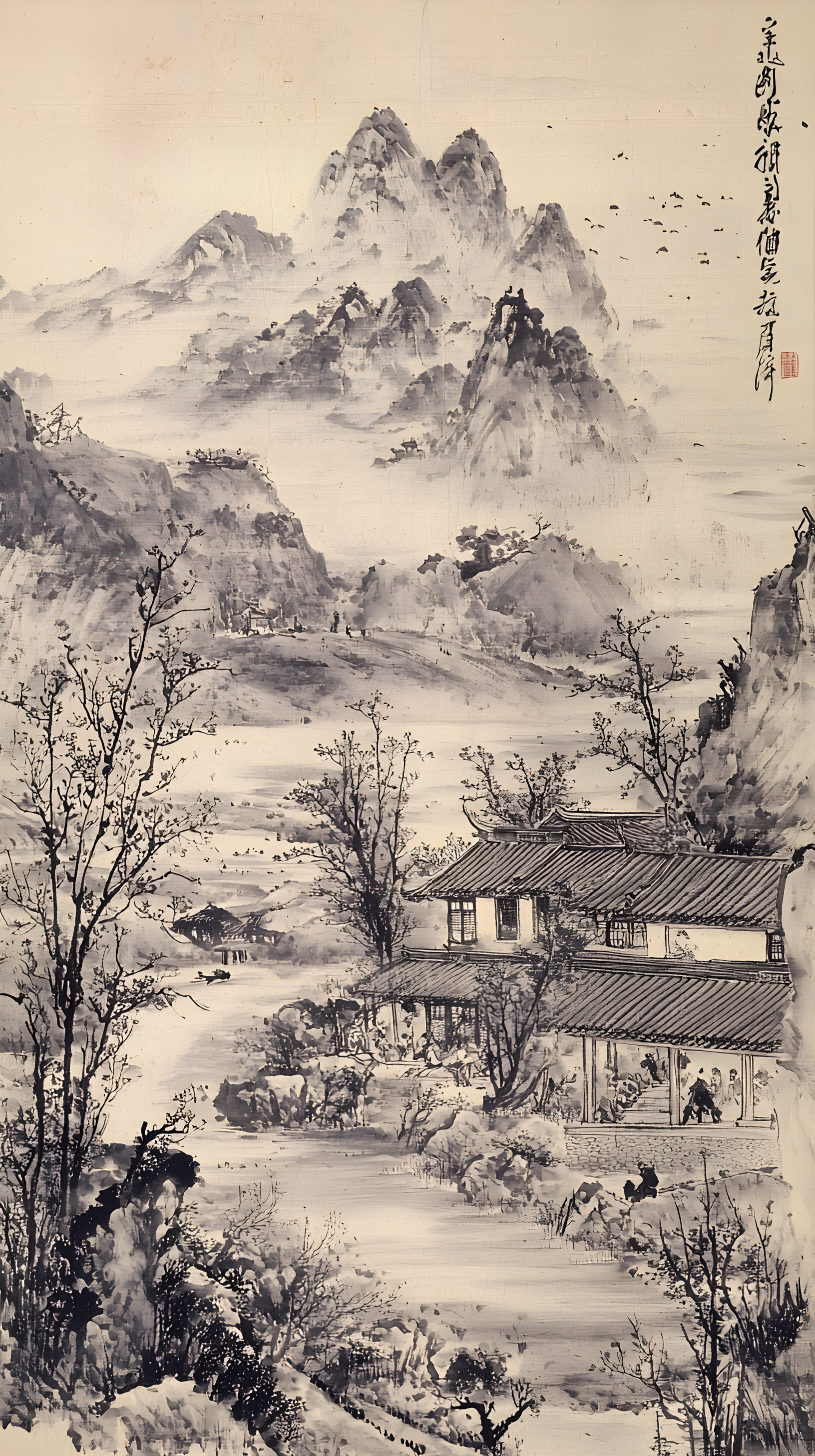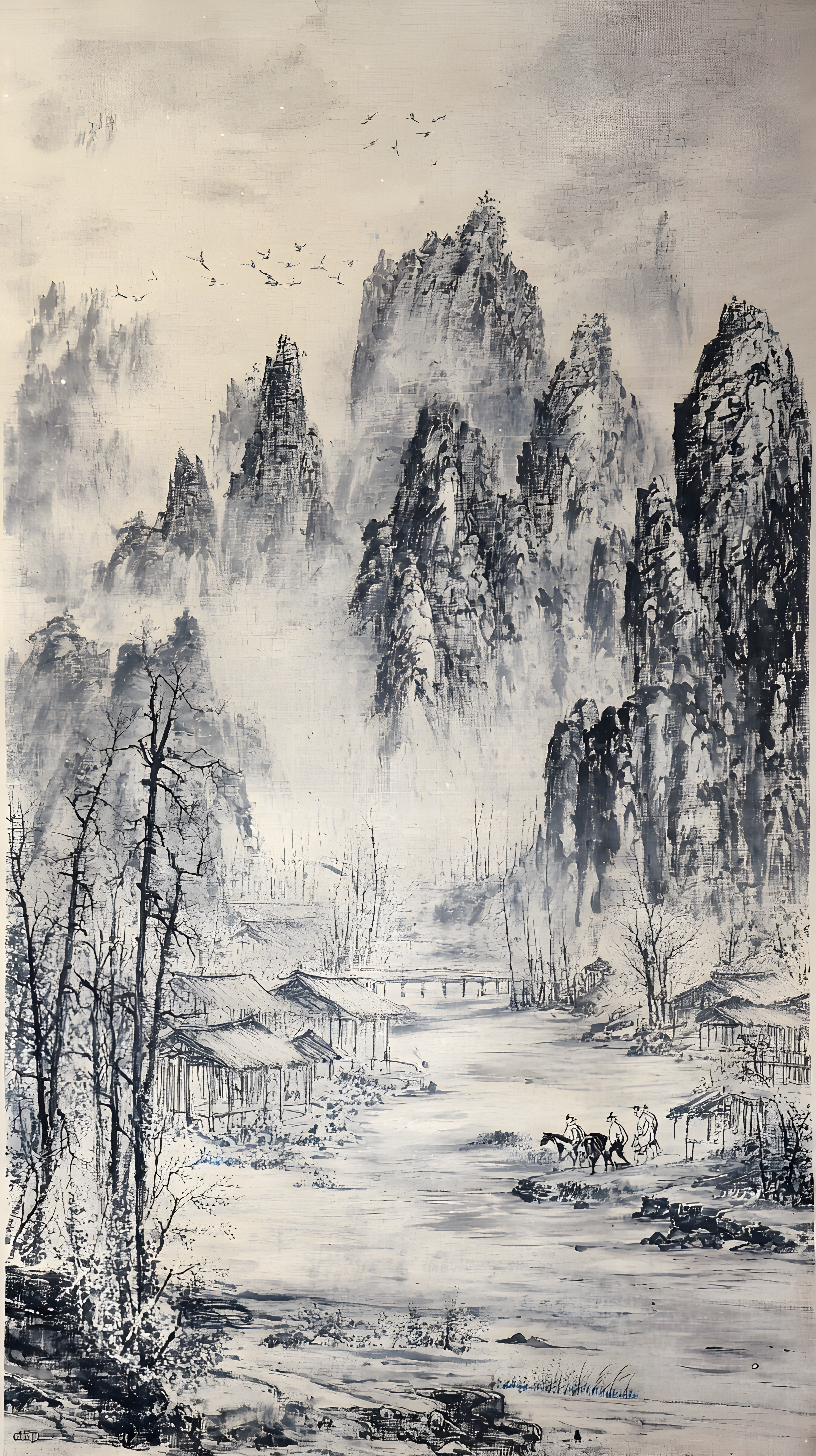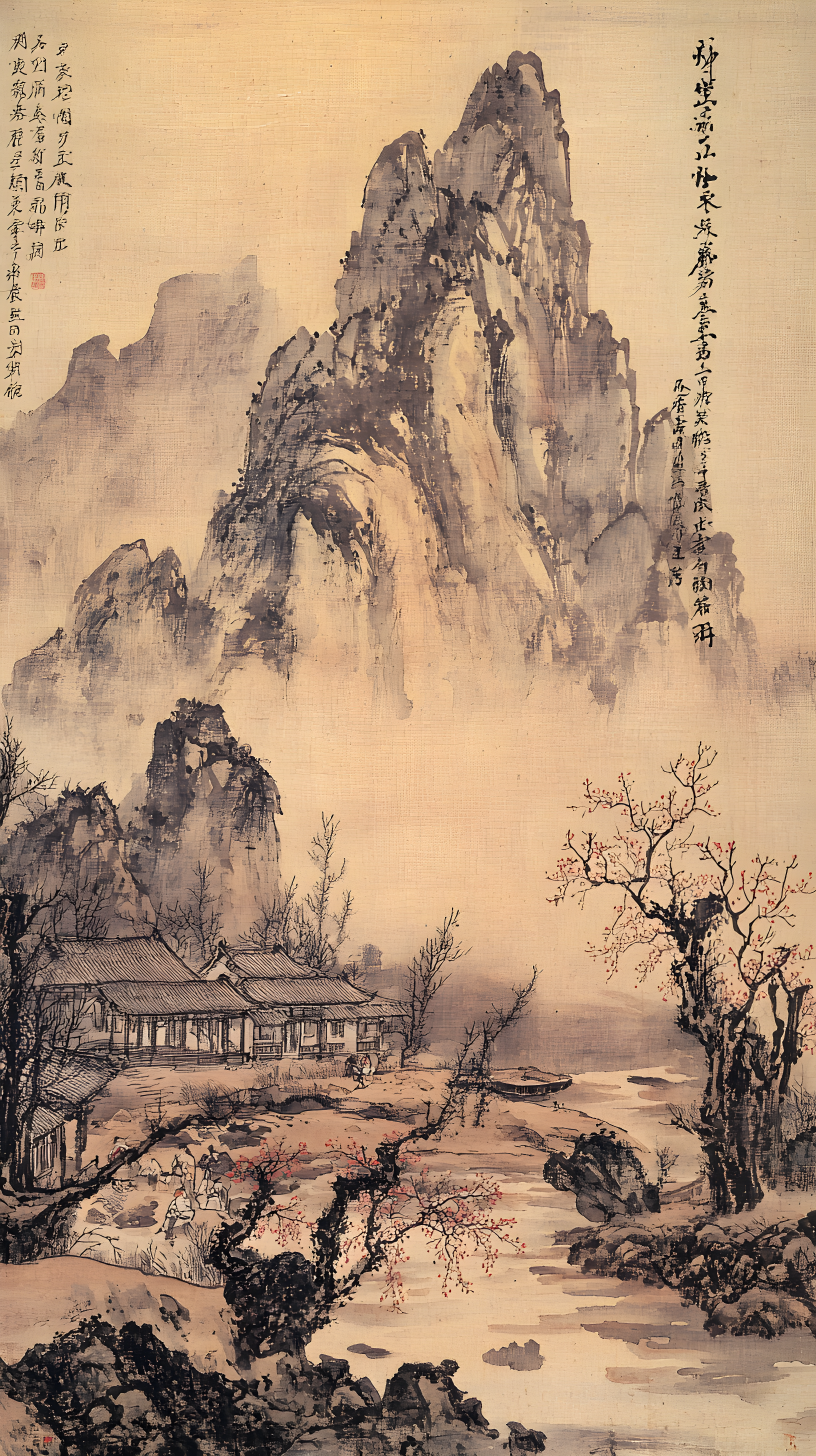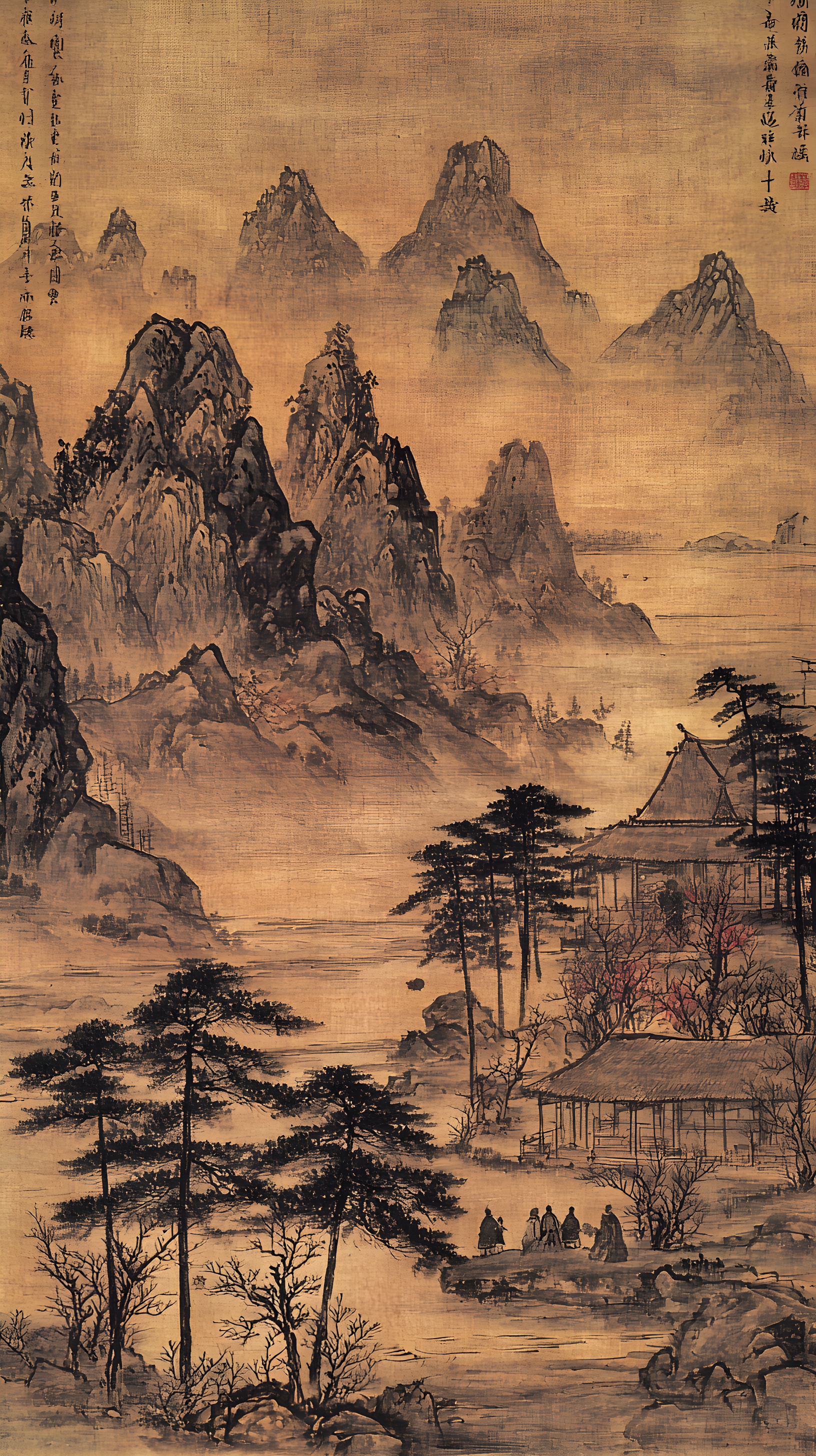 唐寅绘画风格,画面布局严谨整饬,造型真实生动,山势雄峻,石质坚峭,皴法斧劈,笔法劲健,墨色淋漓,充分展现了作者山水画的独特风格。